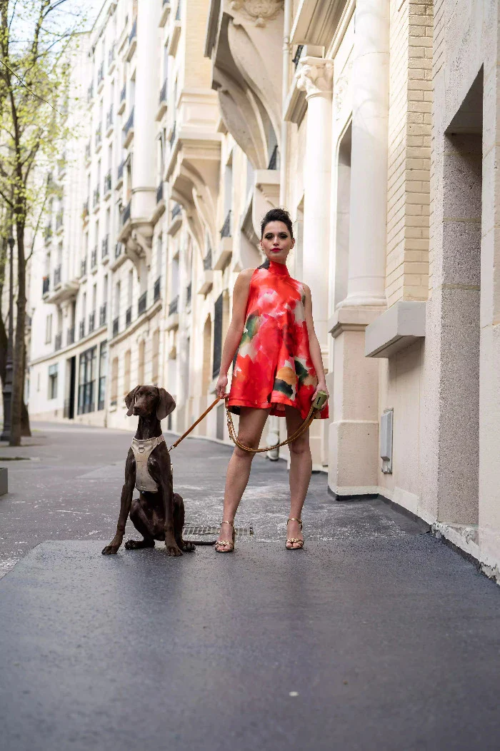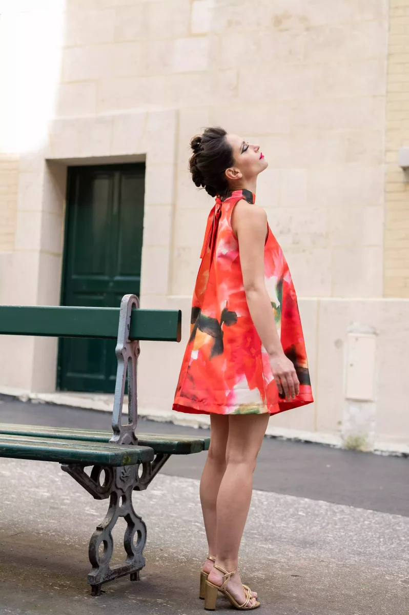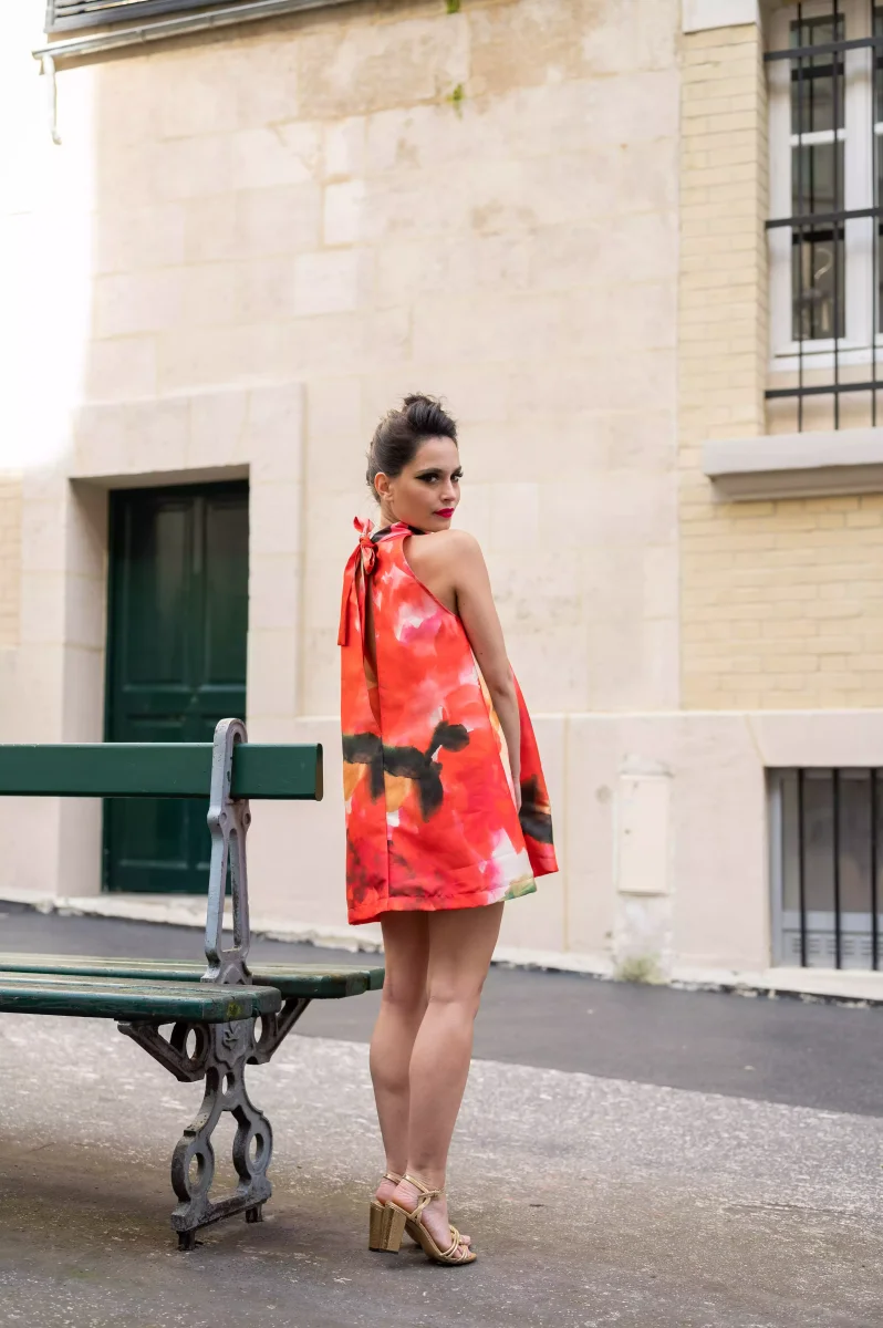 Cette robe trapèze courte présente un col montant et une silhouette sans manches, lui conférant une allure à la fois classique et contemporaine. L’imprimé flamboyant, composé de grandes taches de couleur rouge, orange, et noire, ajoute un dynamisme visuel saisissant à la pièce. L’arrière de la robe affiche une coupe droite avec un détail remarquable : un joli noeud pour attacher la robe dans le cou, ajoutant une touche de sophistication.