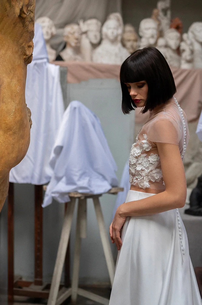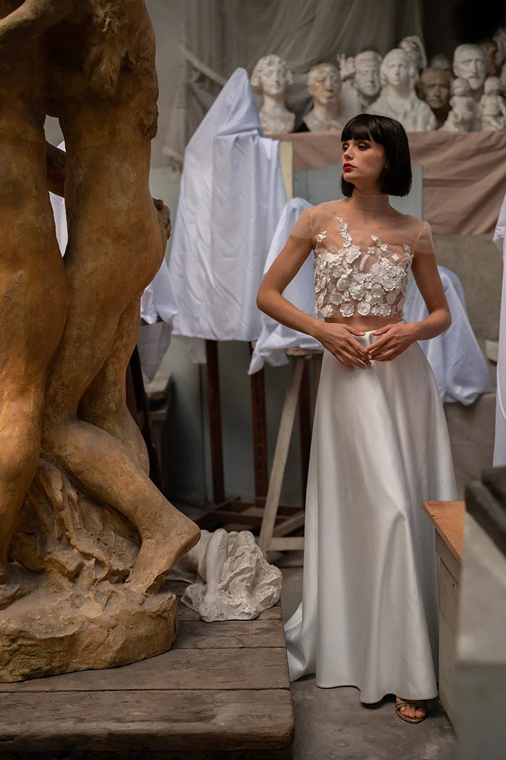 Ensemble à la fois moderne et romantique composé d’un top col montant en tulle brodé à la main de fleurs en dentelle pour dissimuler votre poitrine qui laissera un dos tout en transparence habillé uniquement d’une délicate rangée de boutons. Sa jupe longue en satin duchesse, évasée avec sa grande traine saura parfaitement compléter cette silhouette.