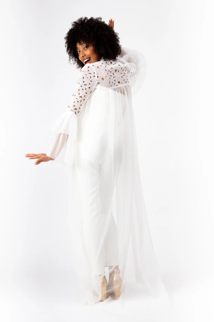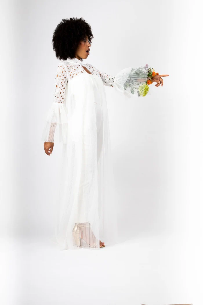 Veste longue avec petites traine en tulle plissé et dentelle, col montant et manches évasée.