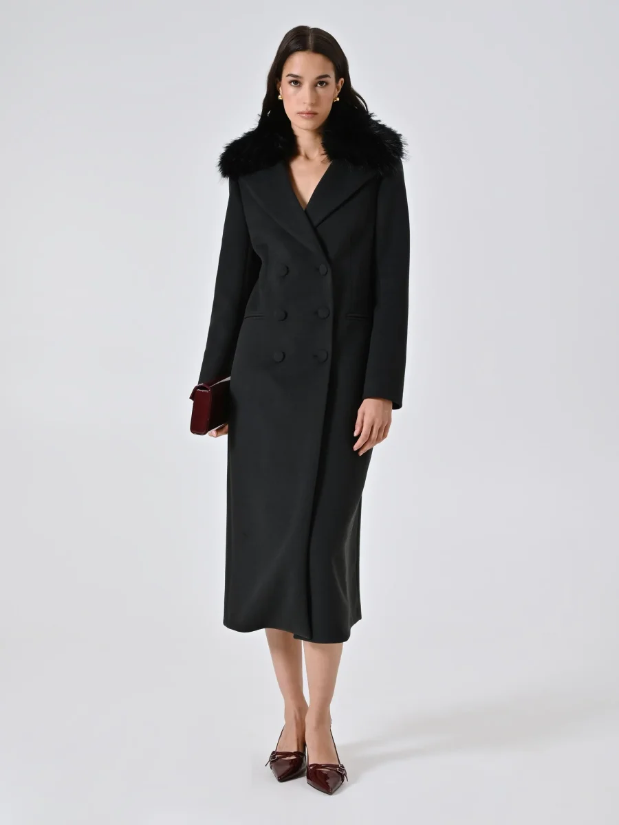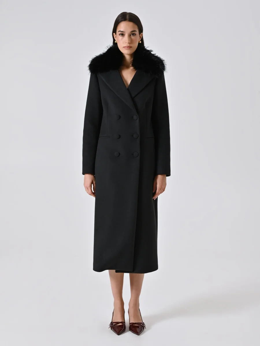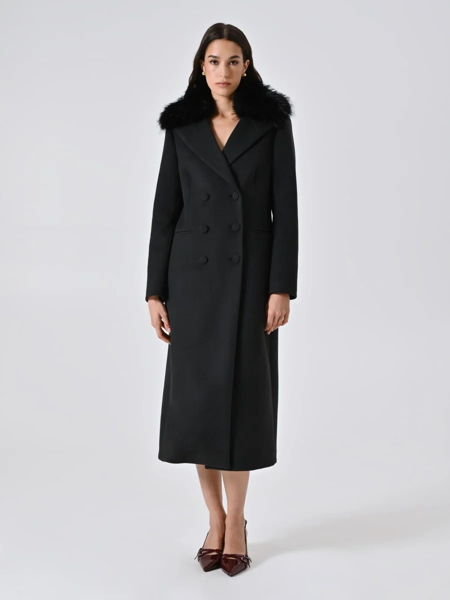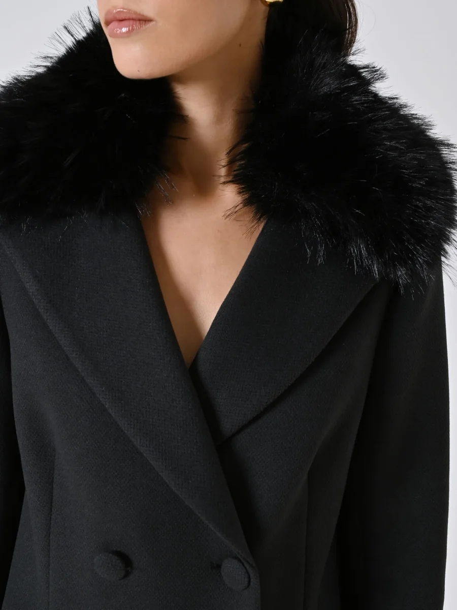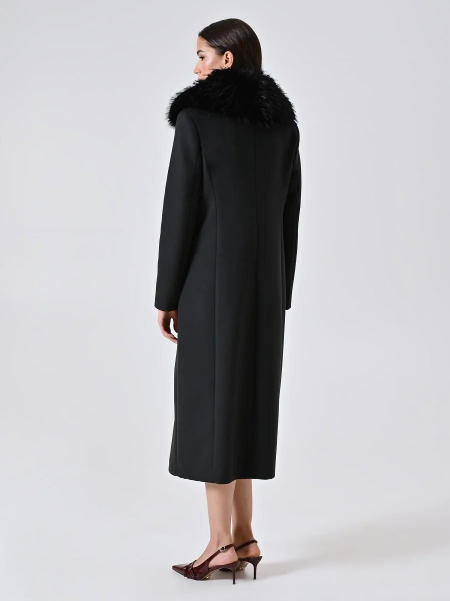Maxi Cappotto Nero misto Viscosa con Collo effetto Pelliccia