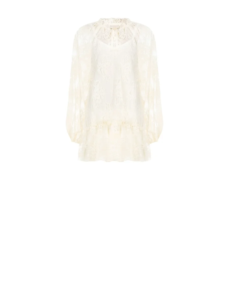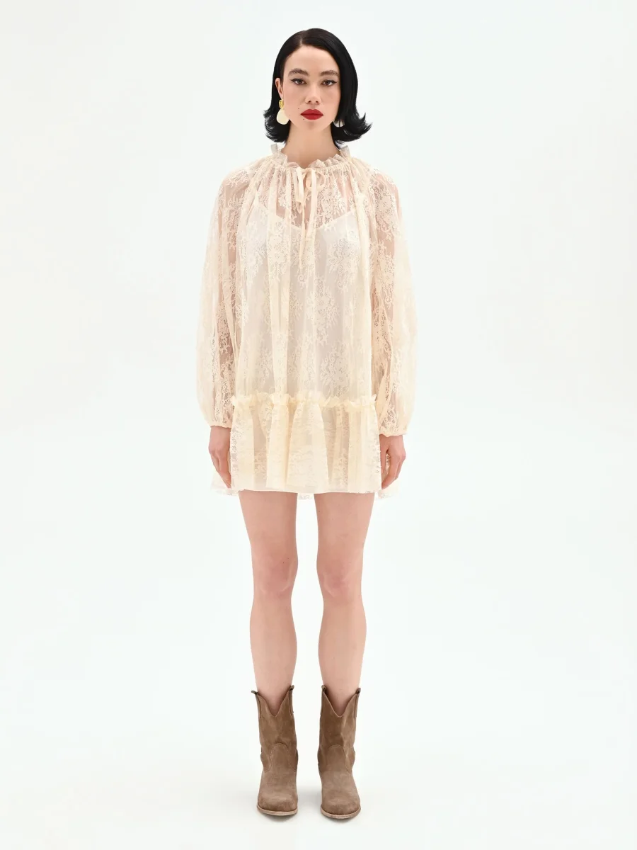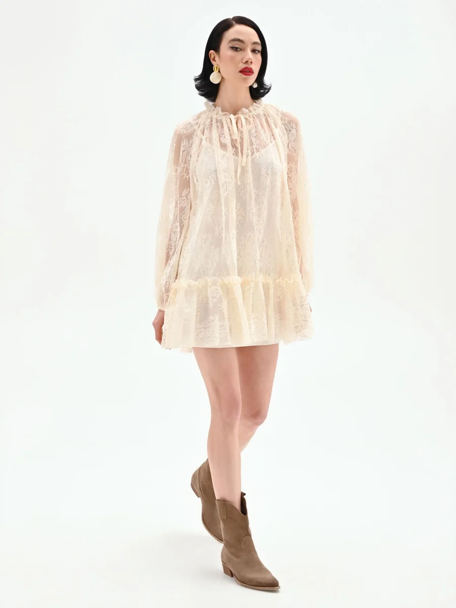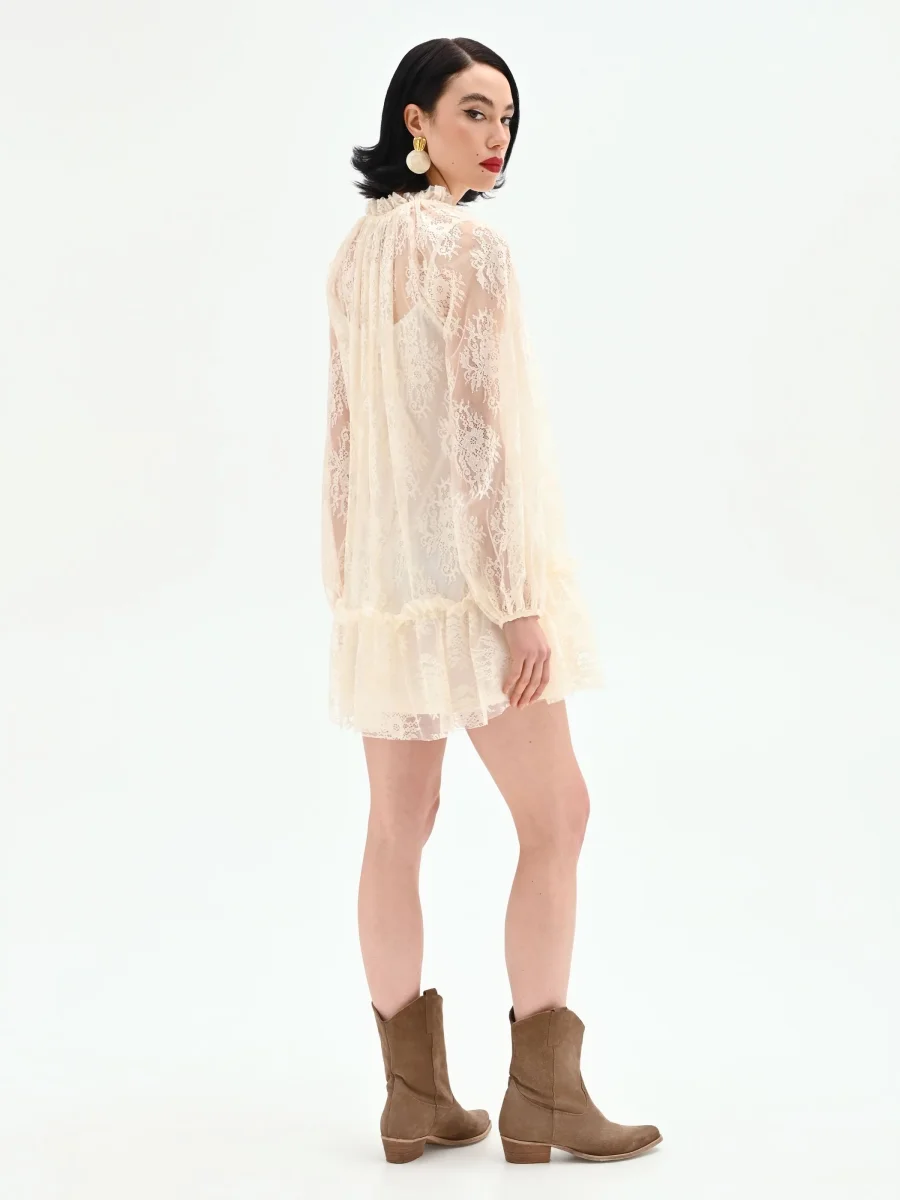 La leggerezza del pizzo incontra un design sbarazzino e romantico nel mini abito panna bianco, un capo pensato per chi ama esprimere la propria femminilità con uno stile versatile. Realizzato interamente in pizzo con un delicato motivo floreale, questo abito si distingue per la sua linea morbida e vaporosa. Lo scollo rotondo, alto e arricciato, è definito da sottili laccetti tono su tono da annodare a fiocco, un dettaglio che aggiunge un tocco ricercato al design. Le maniche lunghe e ampie giocano con un elegante effetto di trasparenza, bilanciato dalla sottoveste interna che garantisce la giusta copertura. La silhouette è completata da una balza arricciata sul fondo che dona movimento e volume alla gonna corta. La chiusura posteriore assicura una vestibilità ottimale. Perfetto per le occasioni informali, dall’aperitivo al tempo libero, questo abito rivela la sua anima contemporanea abbinato a una giacca e a stivali texani, creando un look di carattere e di tendenza, facile da interpretare in ogni momento della giornata.