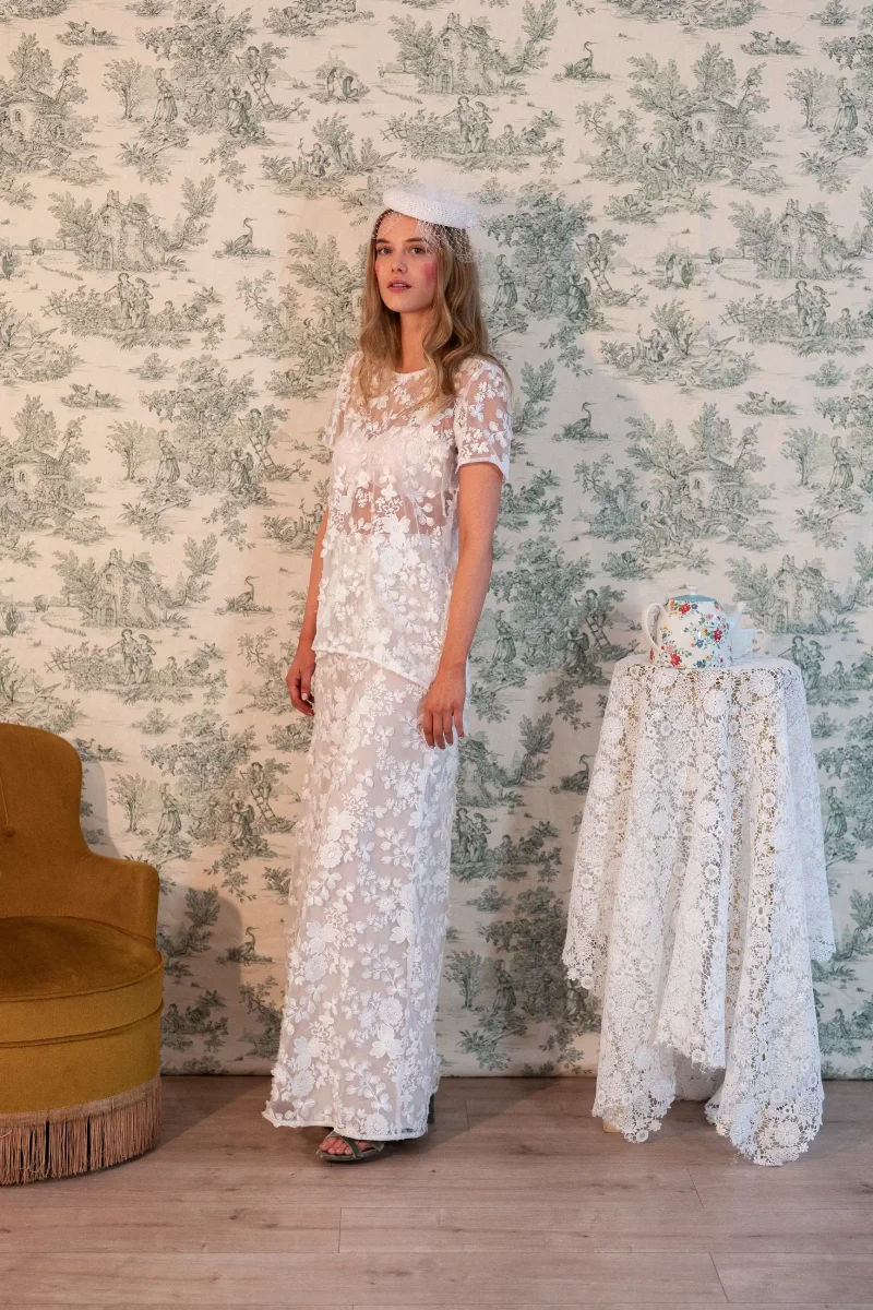 Emma mesure 1,70 m, porte une taille 36 et complète la silhouette avec les sandales à brides Philippa Aqua de chez Flordeasoka et le bibi Pia de chez Mademoiselle Chapeaux.