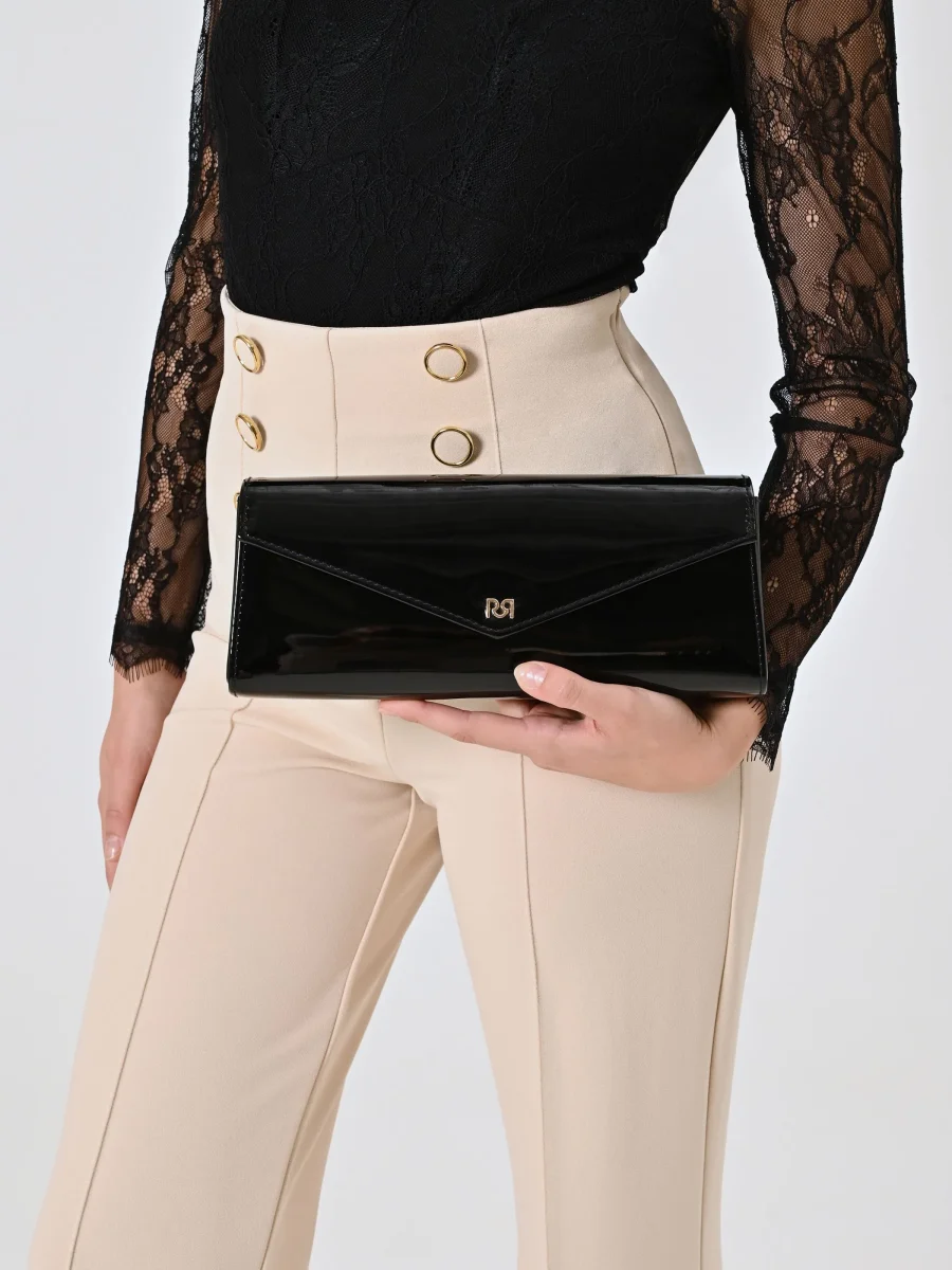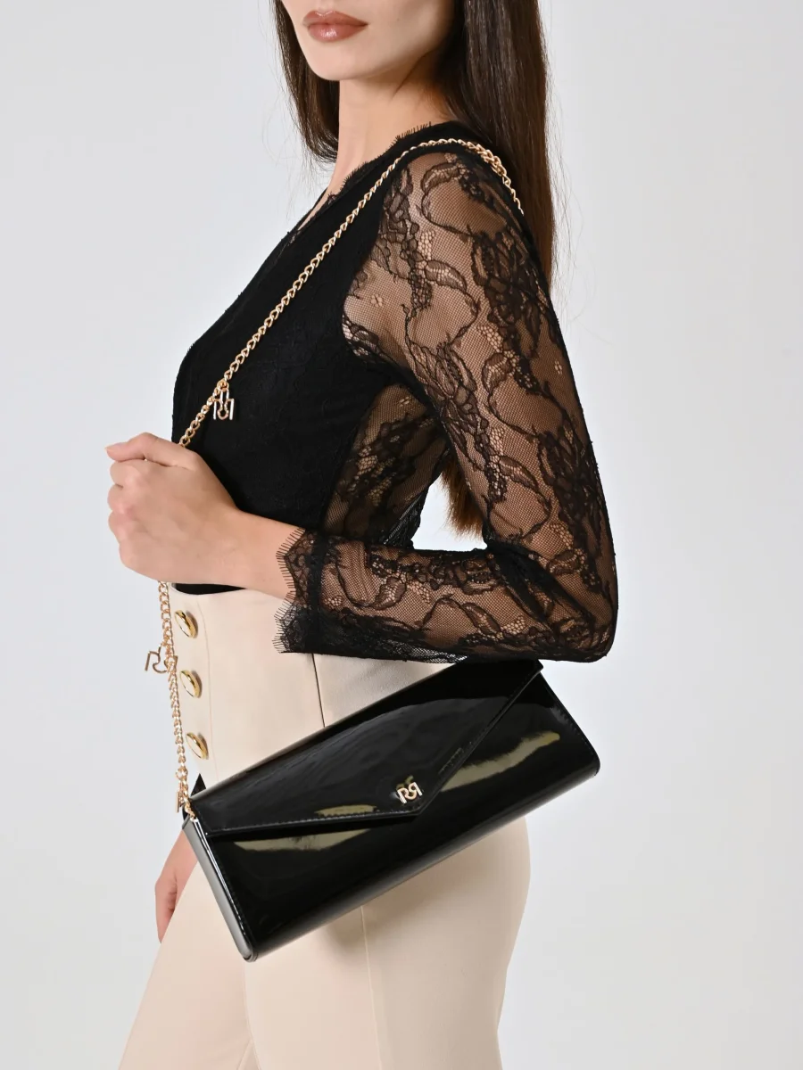 Pochette busta, rigida, realizzata in vernice. La pochette ha la forma rettangolare ed è dotata di catena. Misure: 28x12x4cm. Indossa la pochette assieme ai tuoi outfit più eleganti, per un tocco sofisticato e femminile. La pochette è perfetta per cerimonie o serate fuori. Piccola, ma capiente, può contenere ciò di cui hai bisogno per sentirti sempre al meglio.