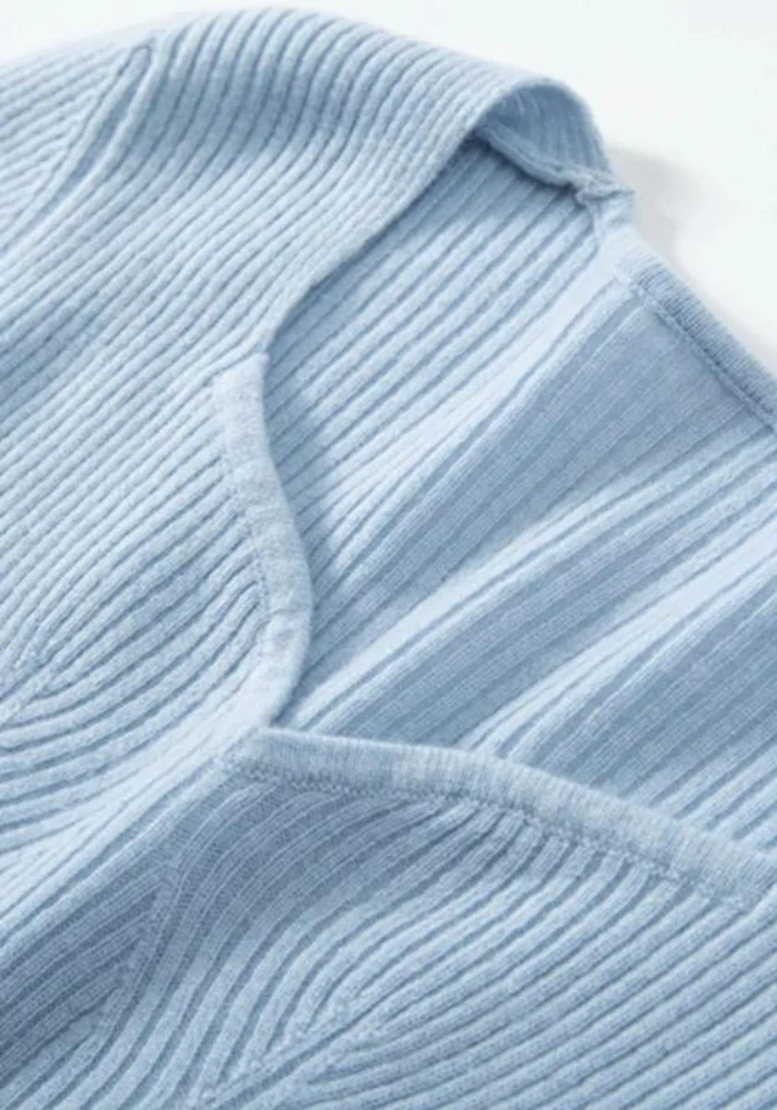 Détails : Col en V, tissu côtelé, base évasée pour un mouvement fluide