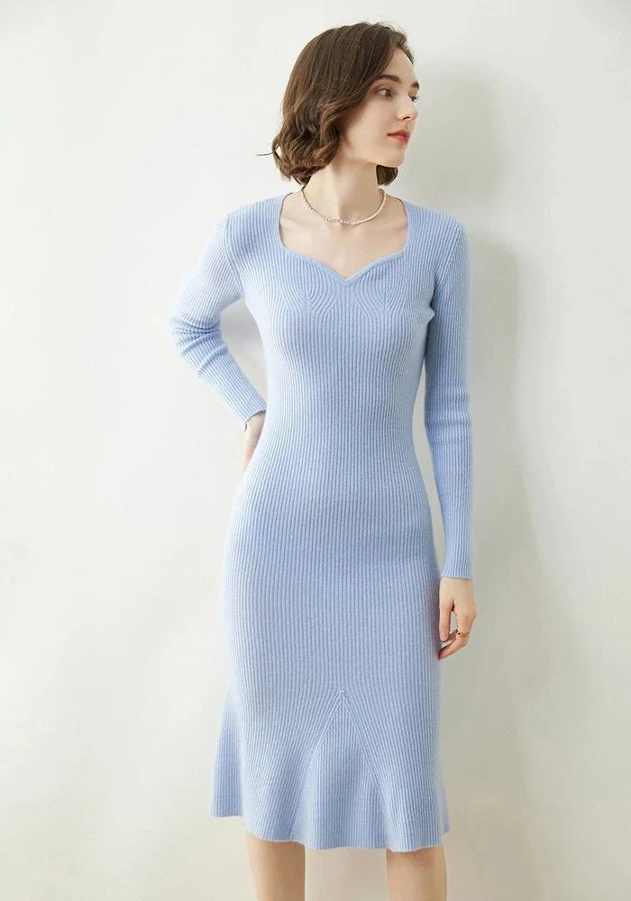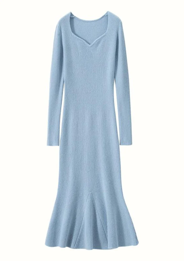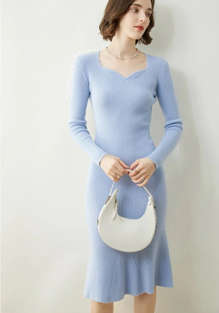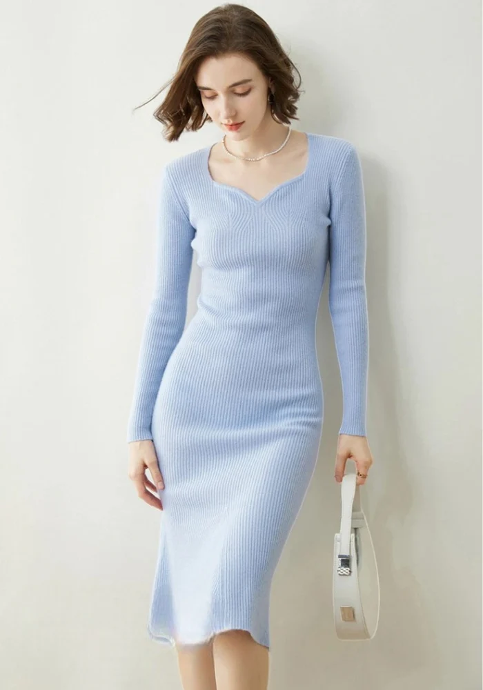 Découvrez la robe bleue d’hiver, chic en cachemire et col V
