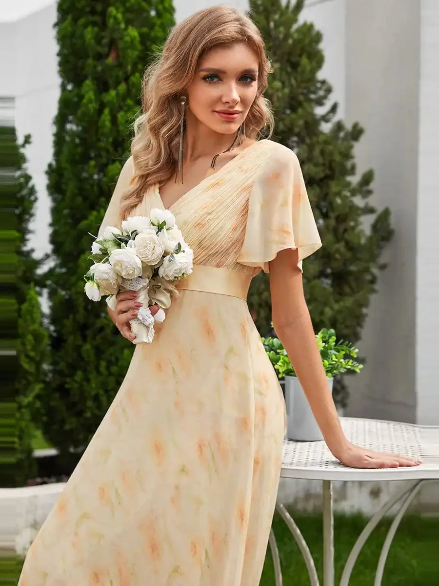 Laissez-vous enchanter par notre robe bohème en mousseline légère aux motifs floraux délicats dans des tons pêche. Sa coupe empire avec col en V et manches flottantes crée une silhouette gracieuse et romantique. La ceinture haute souligne délicatement votre taille tandis que la jupe évasée vous offre liberté de mouvement et élégance. Parfaite pour les cérémonies estivales, cette robe maxi incarne l’équilibre parfait entre sophistication et confort naturel.