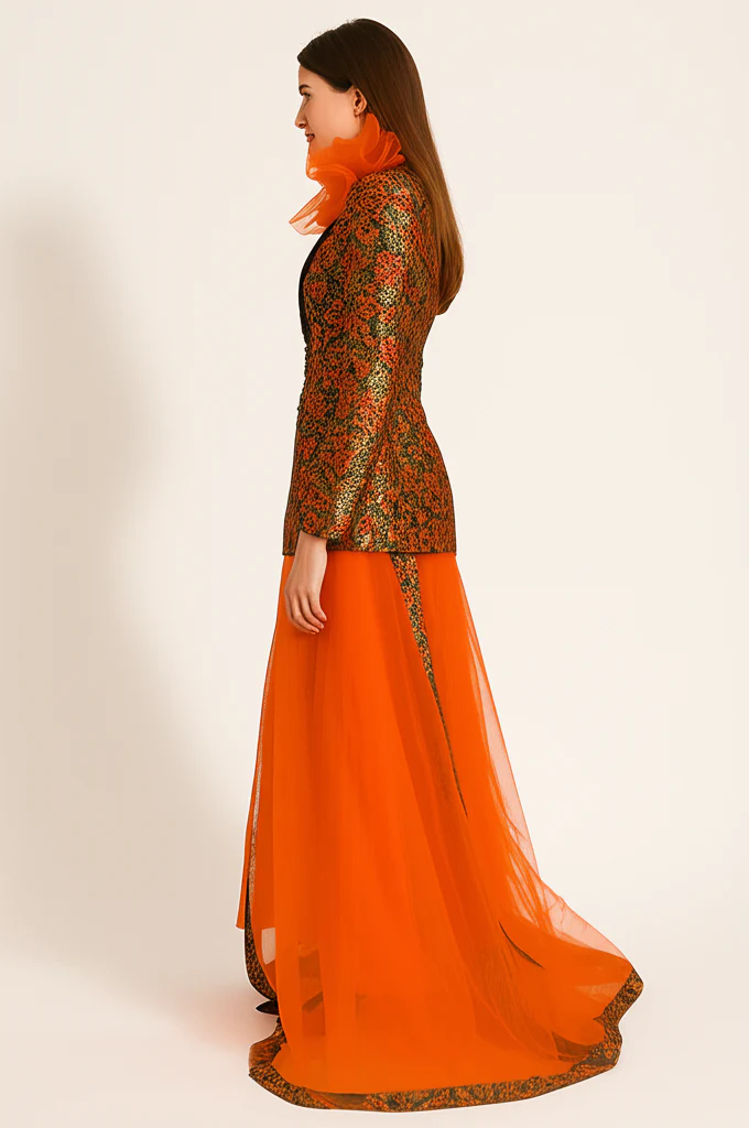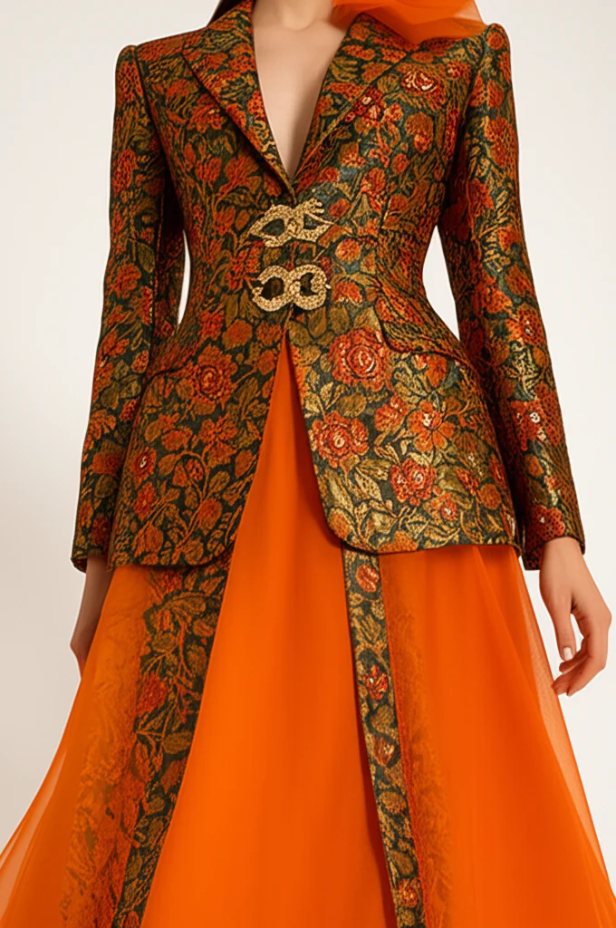 Captivez tous les regards avec cette robe de cérémonie qui allie audace et raffinement. Le blazer ajusté en jacquard floral aux tons orange et dorés crée une silhouette structurée, sublimé par des boutons décoratifs qui marquent la taille. La jupe ample en tulle orange vif apporte volume et légèreté, complétée par une délicate bordure assortie au motif du blazer, parfaite pour faire sensation lors de vos cérémonies prestigieuses.