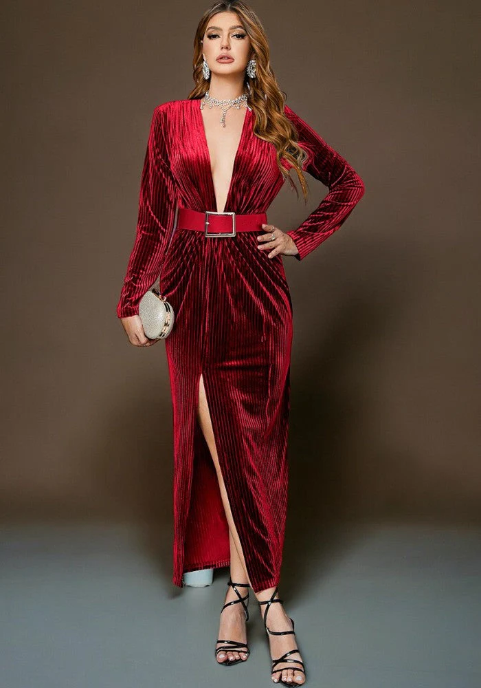 Conçue pour celles qui cherchent à allier confort et style, cette robe propose un tissu doux au toucher et extensible, grâce à sa composition 95% Polyester, 5% Elasthanne. Le décolleté en V et la jupe fendue sur le côté ajoutent une touche de féminité tandis que la ceinture large avec boucle dorée marque élégamment la taille. Disponible en noir, bleu, et rouge, trouvez la teinte parfaite qui exprime votre personnalité.