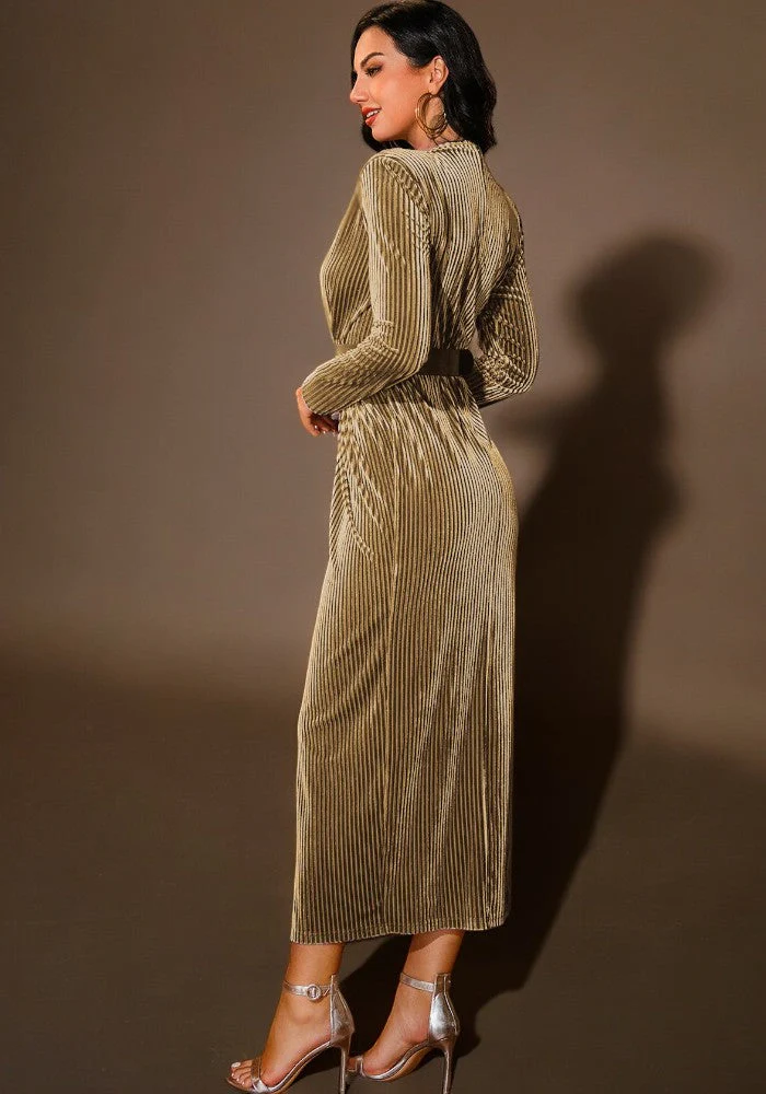 • Détails : Décolleté en V, ceinture large avec boucle dorée, tissu brillant effet velours côtelé