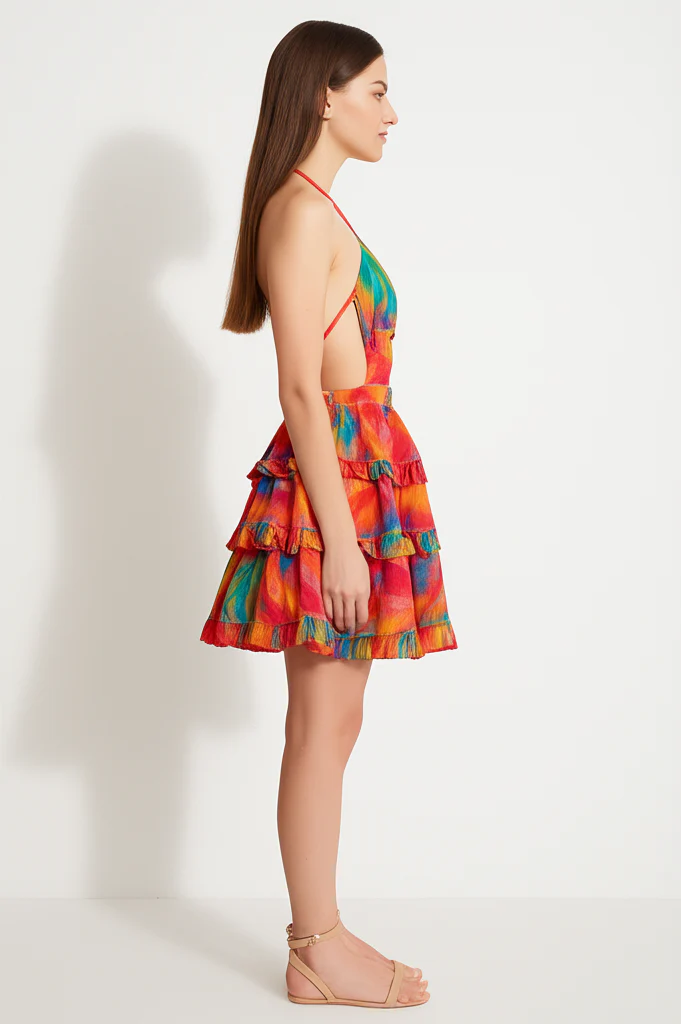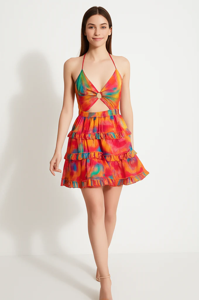 Illuminez vos soirées avec cette robe cocktail aux teintes vibrantes. Son imprimé multicolore crée un effet tie-dye moderne associant des touches de bleu, vert, jaune et rose. La coupe halter neck avec décolleté en V sublimé par un anneau central et son dos nu offrent une silhouette gracieuse. La jupe à volants superposés apporte légèreté et mouvement à chacun de vos pas.