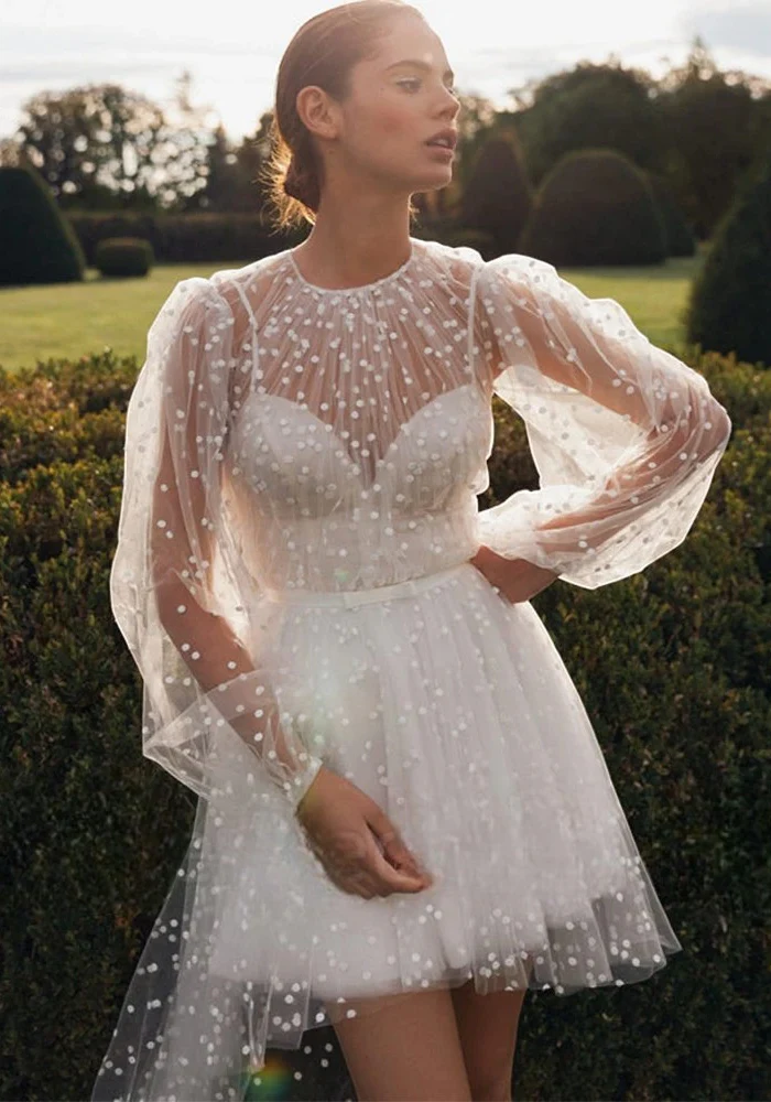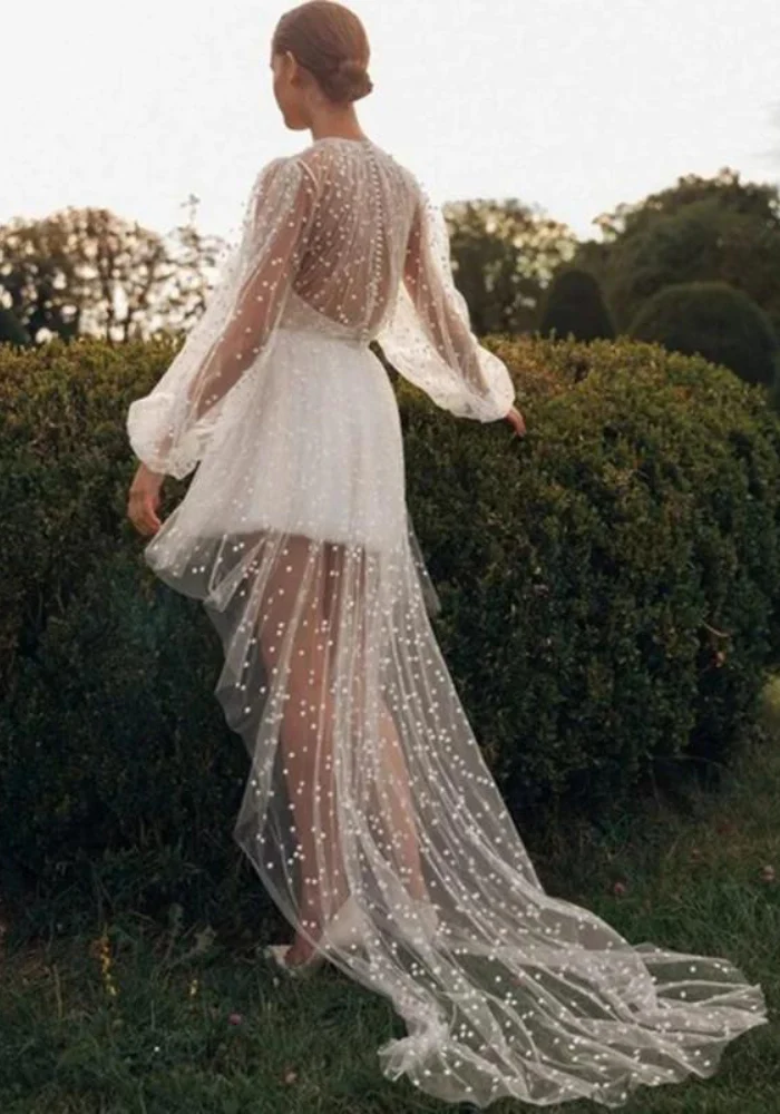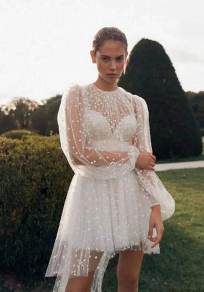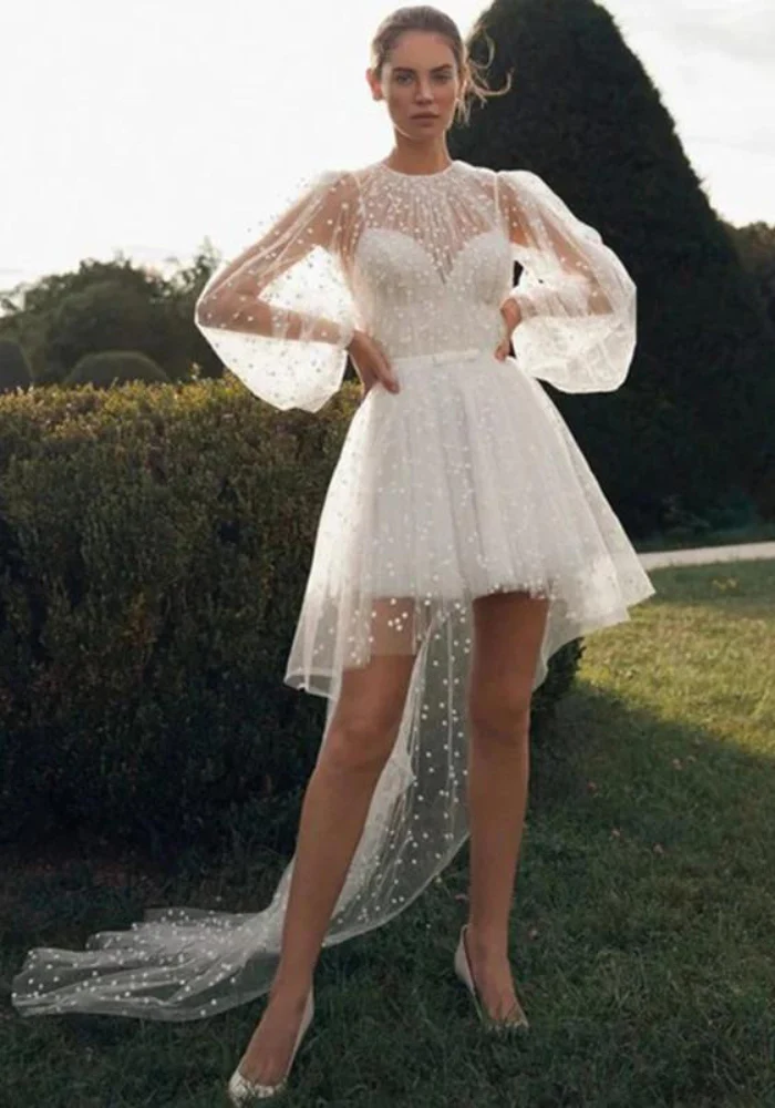 Le secret d’une apparition remarquée tient dans le choix de sa tenue. Cette robe blanche, confectionnée pour embrasser la féminité de celle qui la porte, réunit tout ce que vous cherchiez. Le corsage en dentelle, délicatement travaillé avec des motifs à pois, crée un effet de douceur et de romantisme. Les manches longues bouffantes transparentes ajoutent une touche de mystère, tout en finesse. La jupe évasée en tulle, assortie d’une traîne courte, offre un volume rêvé qui danse à chaque pas, tandis que le col haut rond parachève cette silhouette d’une élégance intemporelle. Cette robe n’est pas juste une tenue, c’est le reflet de votre amour et de votre personnalité unique.