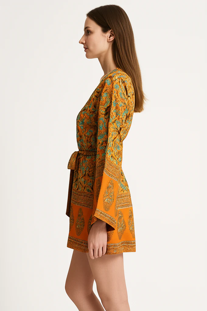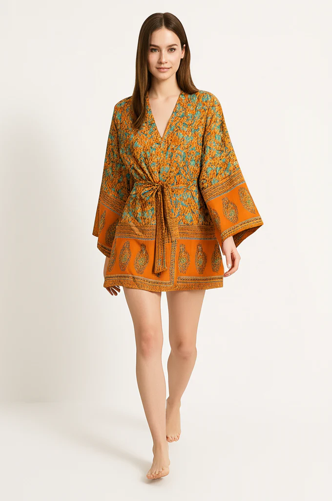 Cette magnifique robe courte allie élégance bohème et confort estival avec son imprimé floral turquoise sur fond orange chaleureux. Sa coupe kimono aux manches amples offre une silhouette fluide et légère, tandis que sa ceinture à nouer permet d’ajuster le tombé et de souligner votre silhouette. Les bordures ethniques en bas des manches et de la robe vous démarqueront en toute circonstance.