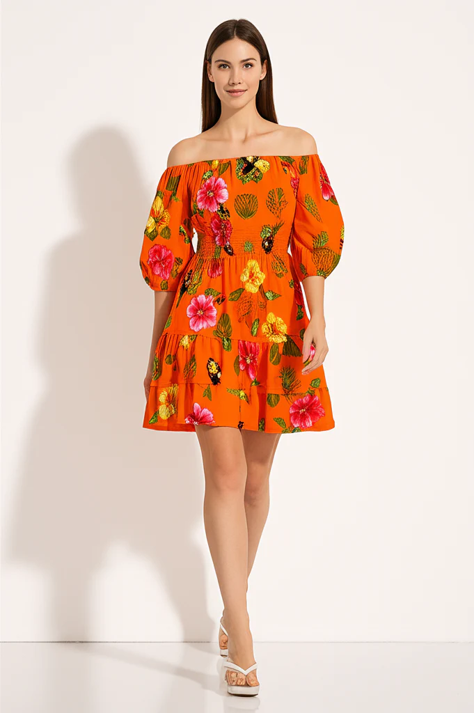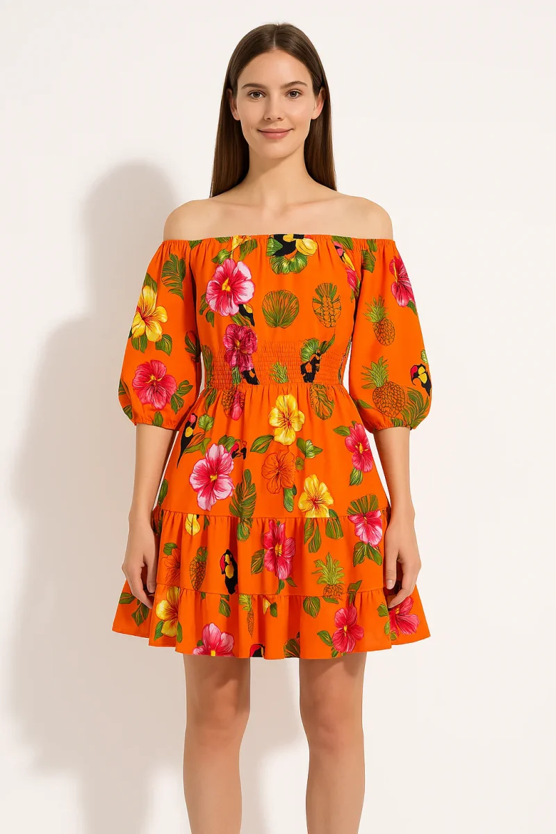 Illuminez votre garde-robe avec cette robe courte orange au motif tropical vibrant. Ses épaules dénudées et ses manches bouffantes sculptent délicatement votre silhouette, tandis que l’élastique à la taille et les volants superposés créent un mouvement fluide idéal pour vos sorties estivales. Son imprimé d’hibiscus sur fond orange apporte une touche exotique parfaite pour la saison.