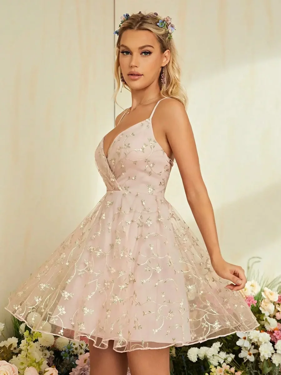 Cette ravissante robe incarne la féminité dans sa forme la plus délicate. Son décolleté en V met en valeur votre silhouette avec élégance, tandis que ses fines bretelles spaghetti offrent un maintien idéal. Le corsage drapé s’évase en une jupe aérienne ornée de délicates broderies florales argentées qui scintillent à chaque mouvement. Le dos nu à lacets croisés ajoute une touche sensuelle, faisant de vous la star de tous les événements, des mariages aux cocktails.