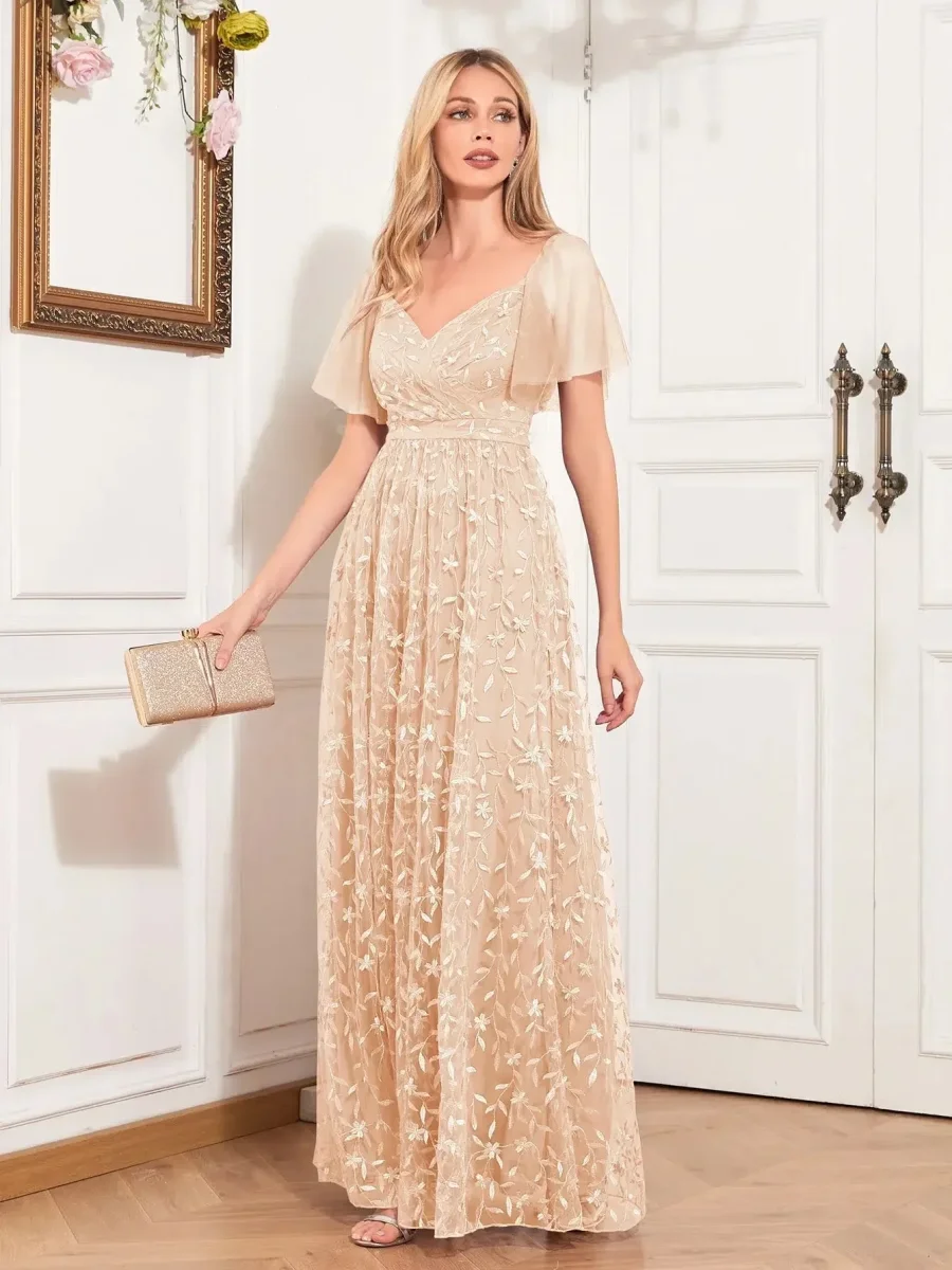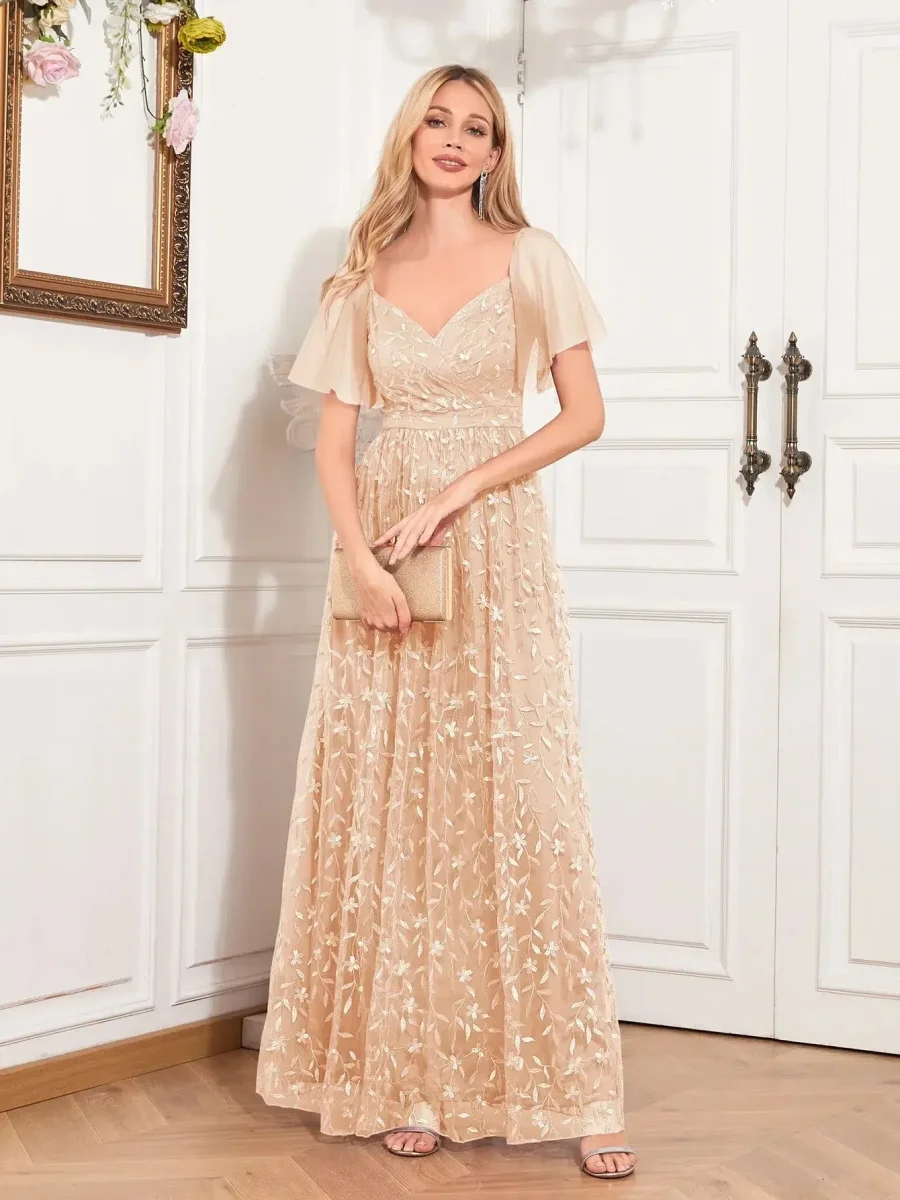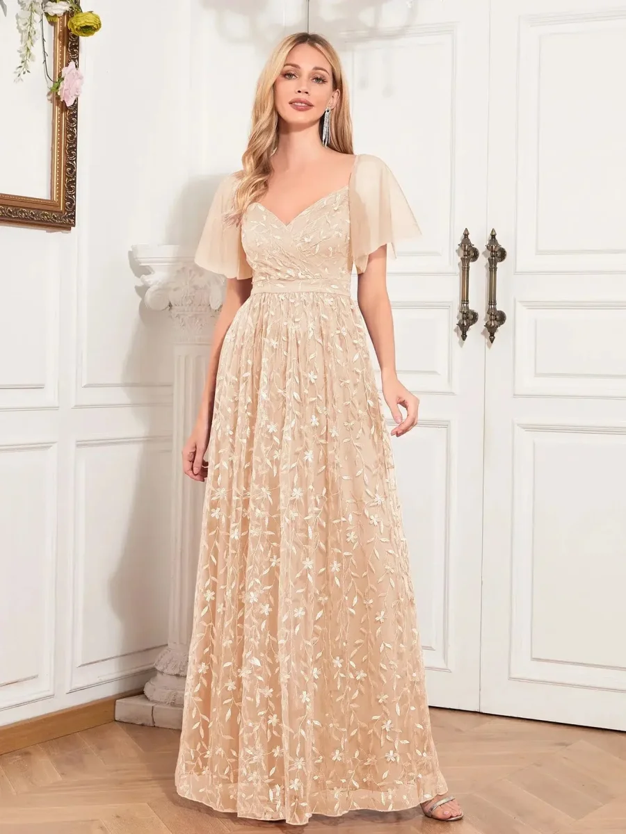 Illuminez les événements prestigieux avec cette robe longue champagne aux broderies florales d’une finesse incomparable. Son décolleté en cœur met en valeur votre buste tandis que les mancherons en voile apportent une touche de romantisme. La coupe évasée princesse allonge naturellement votre silhouette, créant un effet saisissant qui vous fera remarquer lors de vos cérémonies importantes. Les motifs floraux blancs délicatement brodés sur le fond champagne évoquent un jardin printanier pour un rendu sophistiqué et élégant.