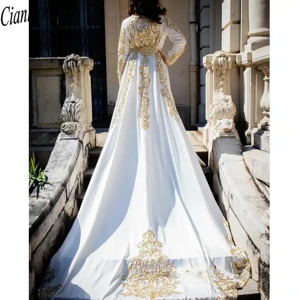 Laissez-vous envoûter par notre sublime création d’exception qui incarne la rencontre parfaite entre tradition orientale et raffinement contemporain. Son tissu blanc immaculé magnifiquement rehaussé de broderies dorées luxuriantes dessine des arabesques et motifs floraux d’une finesse incomparable. Chaque détail est pensé pour faire de vous la reine de votre événement, captivant tous les regards par votre présence lumineuse et votre allure princière.