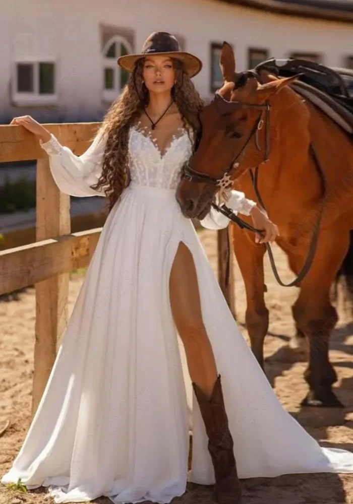 Cette pièce unique, dotée de manches longues bouffantes et d’un décolleté en V raffiné, épouse les formes en toute légèreté. Au niveau du buste, la dentelle finement travaillée ajoute une touche de sophistication. La jupe fluide, élancée par une fente audacieuse, complète ce style bohème chic, tandis que de délicats boutons marquent la taille, offrant un fini aussi romantique qu’élégant.