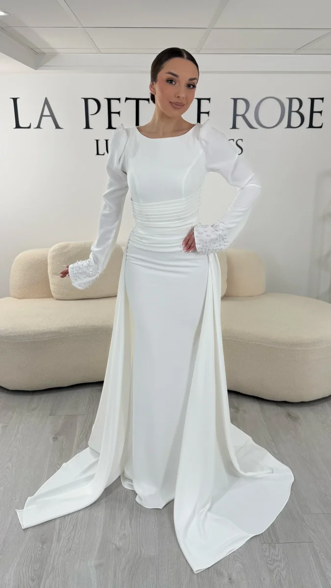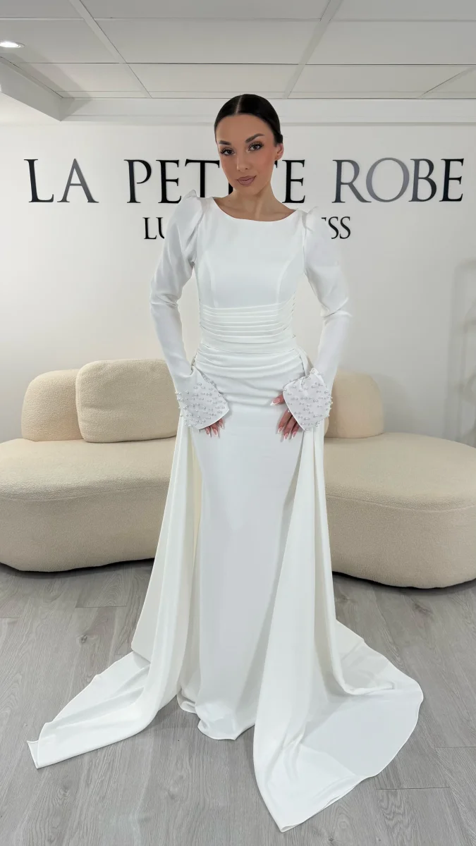 Son col rond met délicatement en valeur le haut du buste. Ensuite, les manches longues apportent une allure distinguée et moderne. Par ailleurs, la coupe ajustée à la taille sublime naturellement la silhouette. La jupe longue descend avec fluidité jusqu’au sol et crée une présence majestueuse. De plus, cette robe de mariée blanche ne possède pas de fente, ce qui renforce son style chic et raffiné.