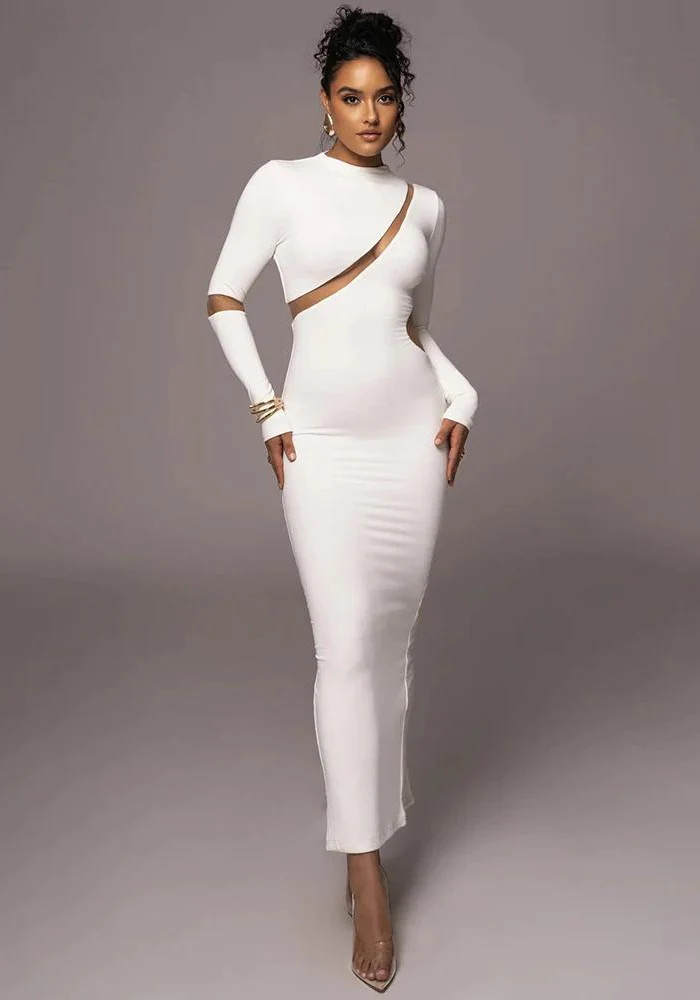 Cette robe d’hiver n’est pas seulement confortable grâce à son tissu élastique, elle est également stylée avec sa découpe asymétrique unique. La fente diagonale traverse délicatement la poitrine pour une allure à la fois audacieuse et chic. Offerte en blanc et noir, elle s’adapte à toutes les préférences. Avec sa coupe moulante et sa longueur midi, elle épouse parfaitement les formes pour une silhouette des plus élégantes.
