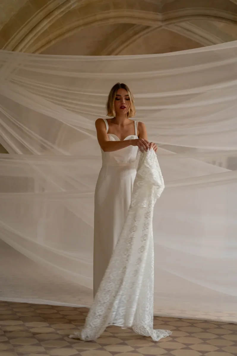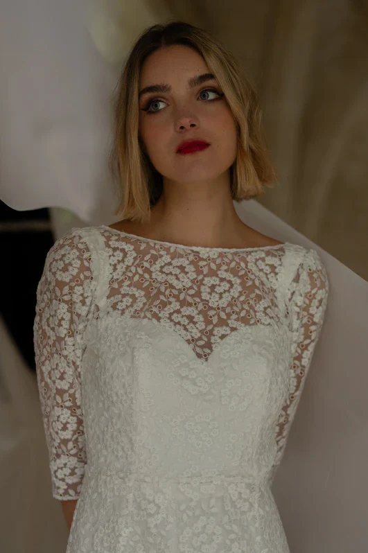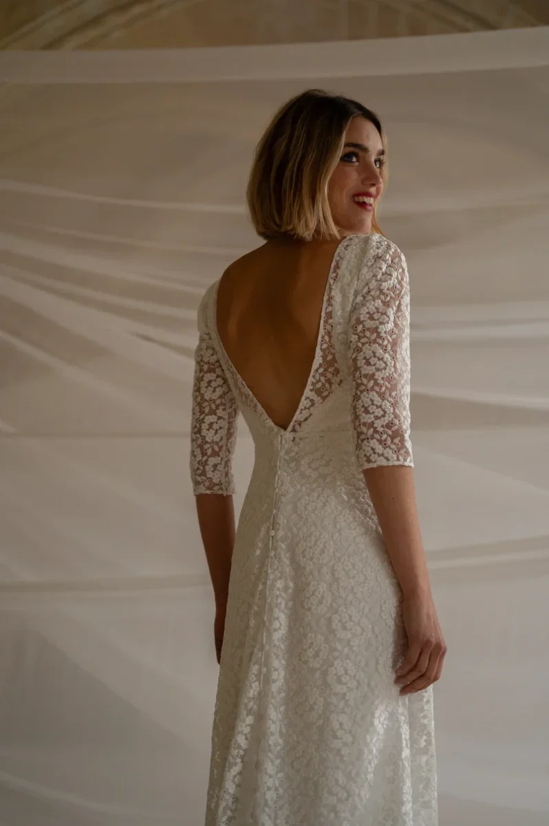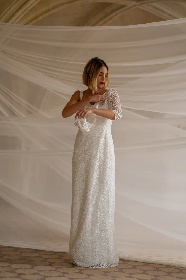 Robe en dentelle non doublée en tulle brodé « dentelle de Calais ». Ses manches 3/4, son dos nu et sa ligne élancée donnera à votre tenue un style raffiné, simple et élégant. La robe est agrémentée de boutons délicats dans le dos, soulignant le dos nu tout en offrant une allure sophistiquée. A porté sur une robe à bretelle elle permet de créer un look deux en un pour un mariage en deux temps.