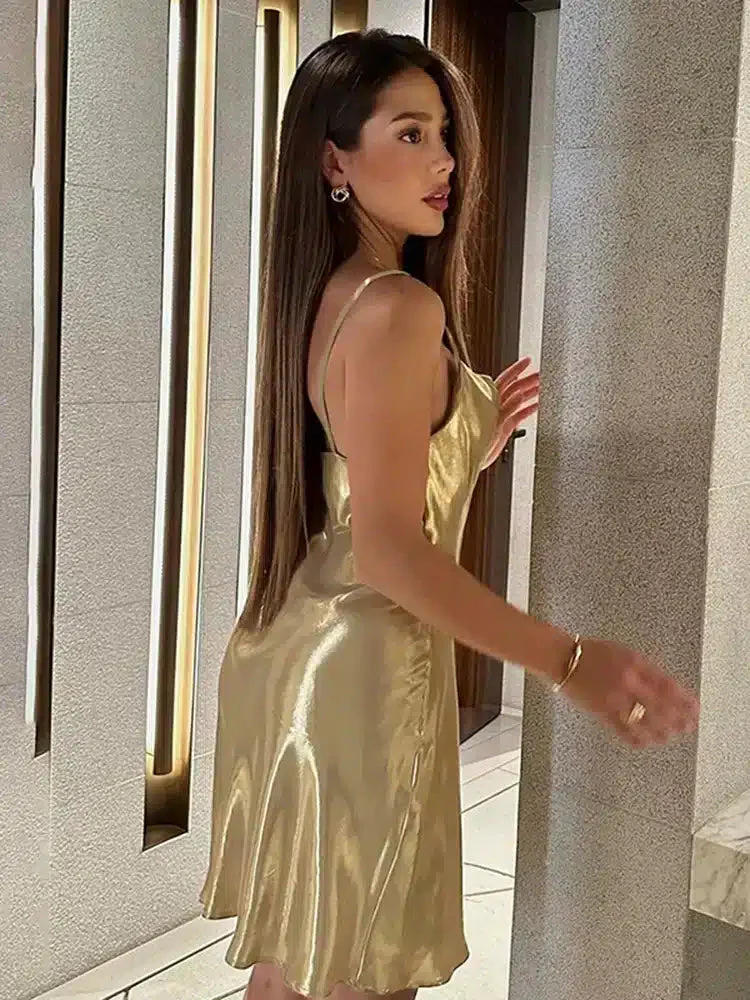 Laissez-vous séduire par notre sublime robe en satin doré qui attire tous les regards. Son tissu scintillant épouse parfaitement votre silhouette tout en offrant une liberté de mouvement idéale. La coupe évasée et le col drapé apportent une touche d’élégance intemporelle, tandis que les fines bretelles spaghetti dévoilent délicatement vos épaules. Cette robe courte au-dessus du genou est conçue pour sublimer votre féminité lors des occasions spéciales, des fêtes de fin d’année ou des soirées glamour.