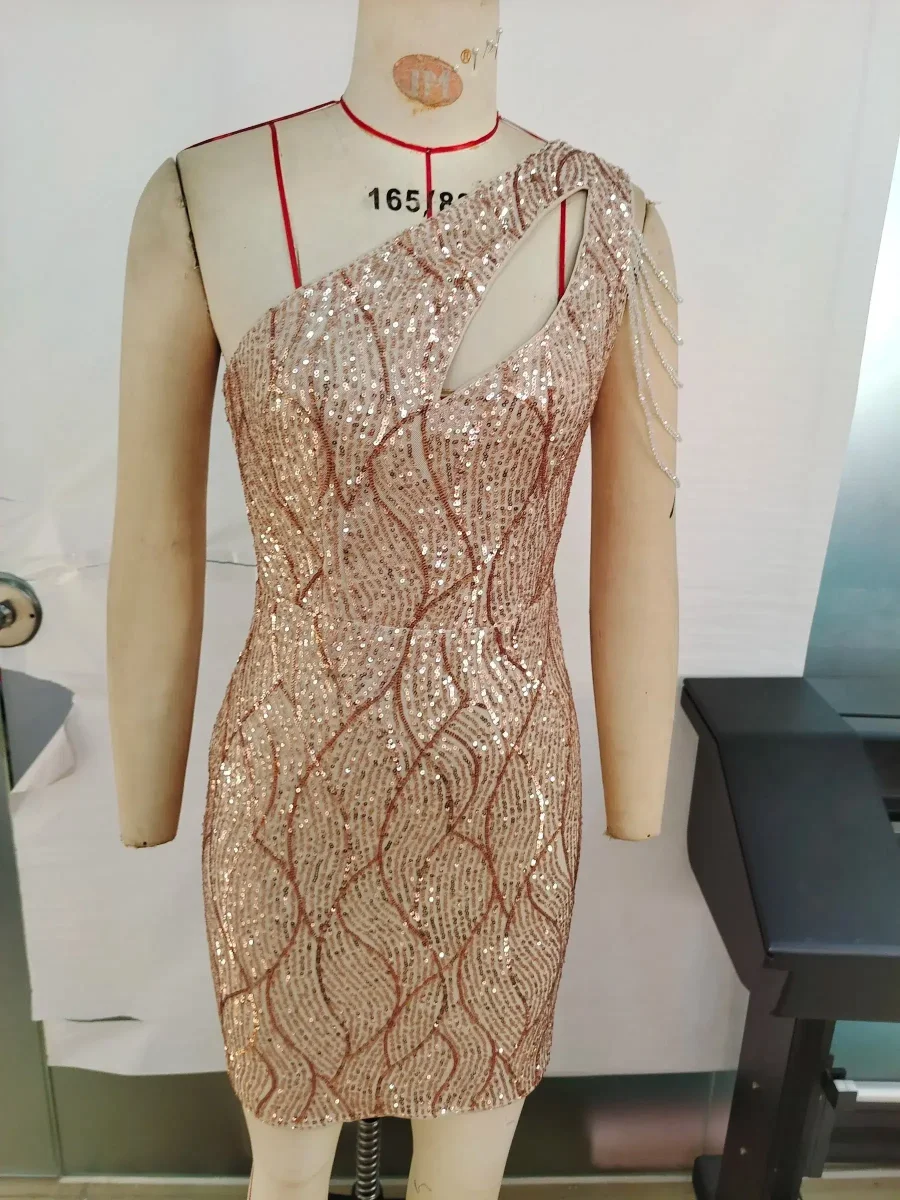 Cette robe n’est pas un simple vêtement, c’est une véritable déclaration de style. Imaginez-vous faire votre entrée, chaque pas provoquant un scintillement de mille feux grâce aux paillettes dorées. La coupe asymétrique dévoile subtilement une épaule, tandis que les chaînettes délicates dansent avec grâce le long de votre bras. Sa longueur mini met parfaitement en valeur vos jambes, vous offrant une silhouette harmonieuse et élancée qui ne manquera pas d’attirer tous les regards.