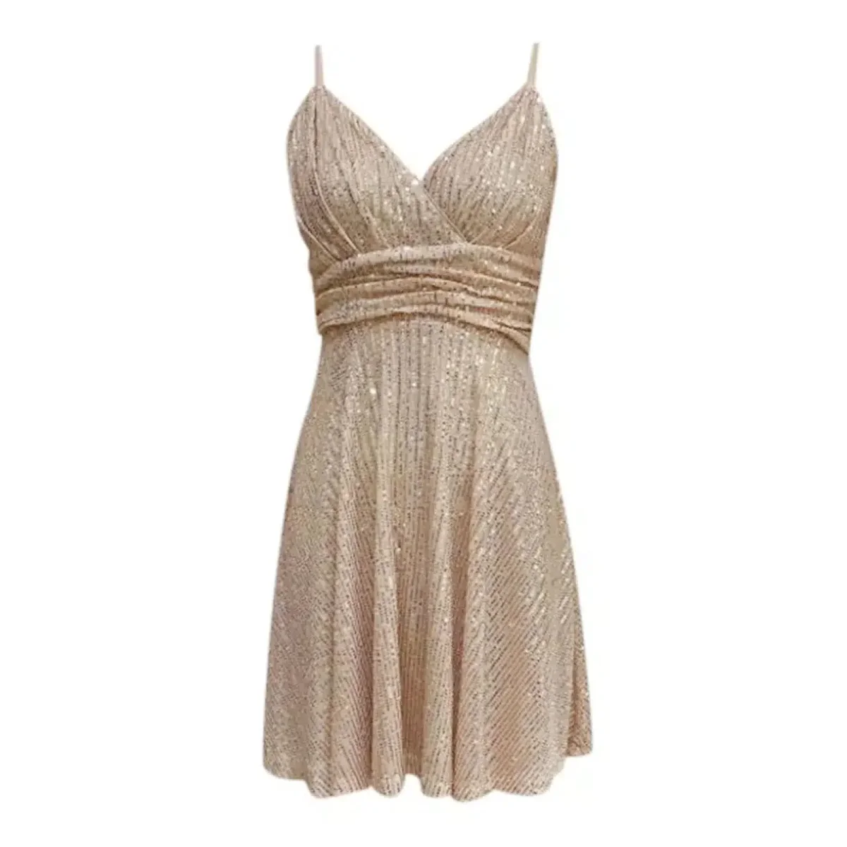 Captivez tous les regards avec notre robe à paillettes dorées conçue pour sublimer votre silhouette. Sa coupe trapèze parfaitement étudiée avec taille cintrée met en valeur vos courbes naturelles, tandis que son élégant décolleté en V et ses fines bretelles spaghetti apportent une touche de féminité raffinée. Les paillettes scintillantes enveloppent votre silhouette d’une aura lumineuse, vous transformant en véritable star de chaque événement. Sa longueur au-dessus du genou offre une liberté de mouvement idéale pour danser jusqu’au bout de la nuit.