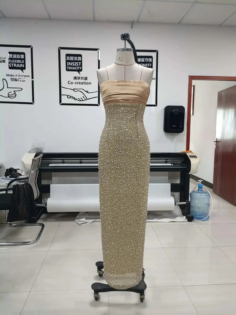 Sublimez votre silhouette avec notre Robe Éclatante Dorée, une création d’exception où le bustier droit satiné s’épanouit en une cascade de paillettes et perles cousues à la main. Sa coupe sirène épouse parfaitement vos courbes tandis que sa longueur maxi vous confère une allure majestueuse digne des plus grands tapis rouges. Le dos partiellement dénudé avec sa fermeture éclair discrète ajoute une touche de sensualité raffinée à cette robe extraordinaire.