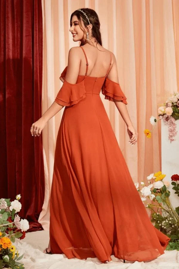 Type de coupe : Empire Longueur : Longue Matière : Mousseline Manches : Manches papillon et fines bretelles Encolure : Col en forme cœur Fermeture : zip avec ajustement mince Détails : Fronces sur le buste, fente latérale