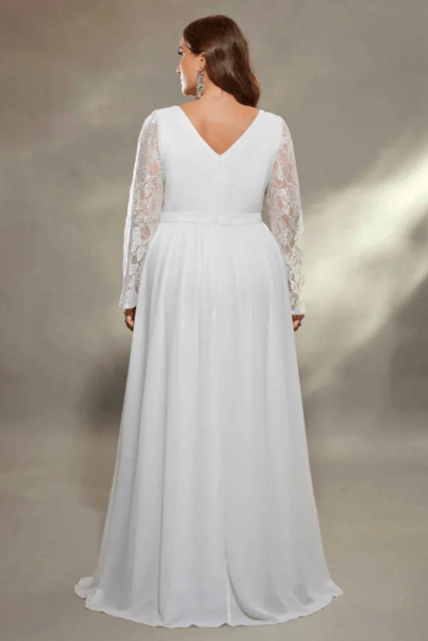 Matière : Tissu synthétique et dentelle Coupe : Fluide et cintrée à la taille Décolleté : Col en V délicat Manches : Longues en dentelle transparente Dos : Fermeture discrète, décolleté en V Longueur : Robe longue vaporeuse Détails : Ceinture fine marquant la taille, dentelle florale