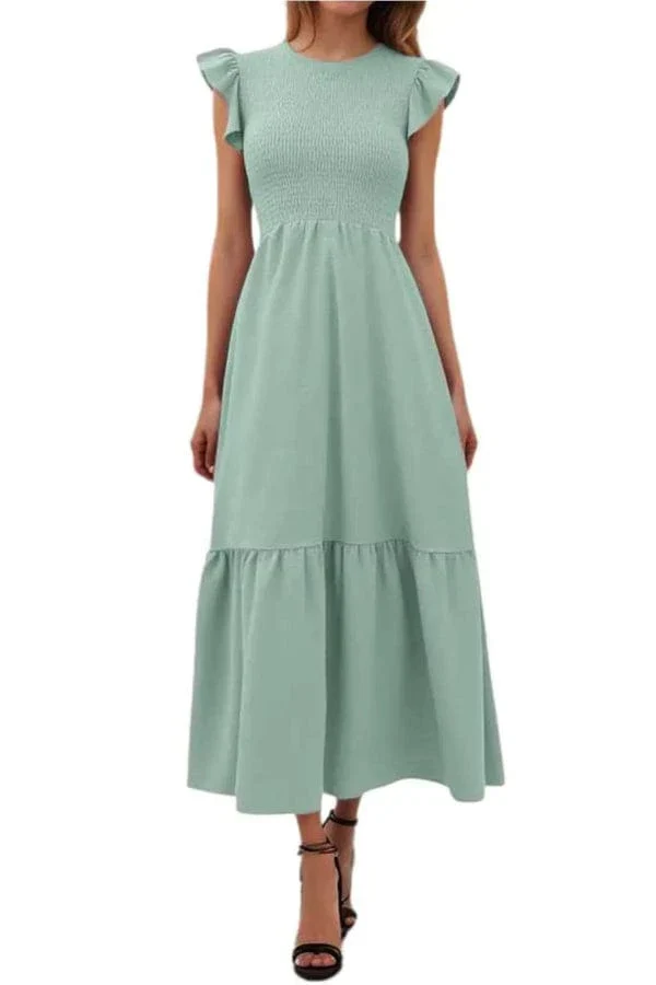 - Coupe : A-line, manches courtes froncées, col rond discret