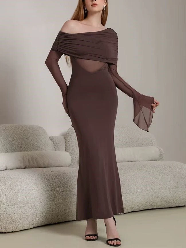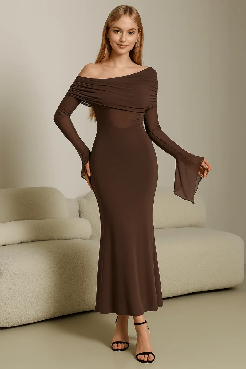 Matière : Tissu synthétique, extensible et doux Coupe : Moulante avec effet drapé Décolleté : Asymétrique, dévoilant une épaule Manches : Longues et évasées Dos : Drapé ajusté avec transparences subtiles Fermeture : Enfilage sans fermeture Détails : Effet sculptant, résille transparente, finition fluide