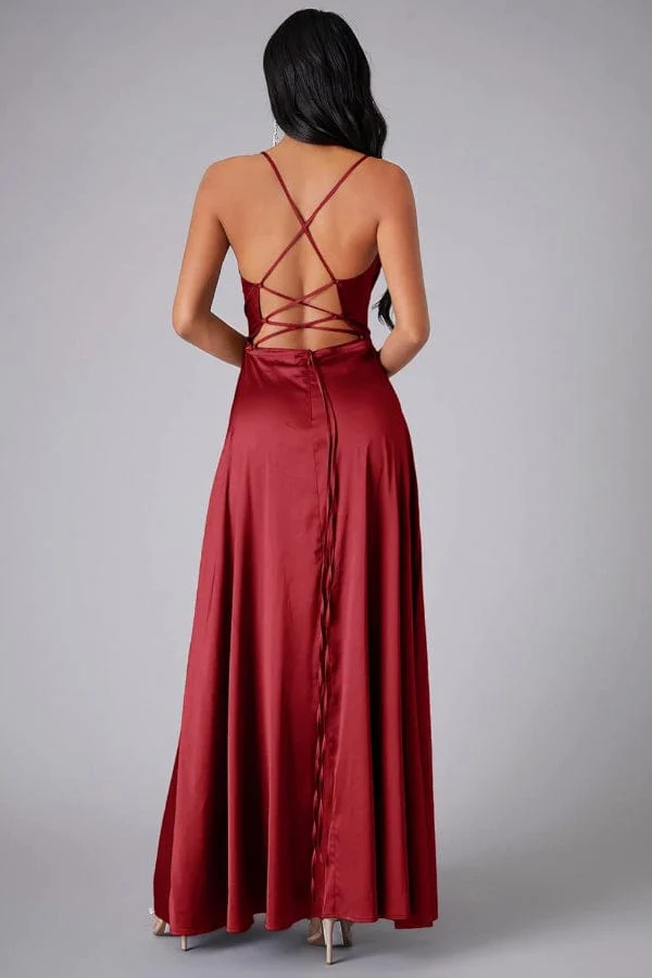 Matière : Satin Coupe : Ajustée à la taille, jupe fluide avec fente Décolleté : Col bénitier Manches : Fines bretelles ajustables Dos : Lacé croisé avec fermeture invisible Longueur : Robe longue jusqu’aux chevilles Détails : Effet drapé, fente latérale, tissu soyeux
