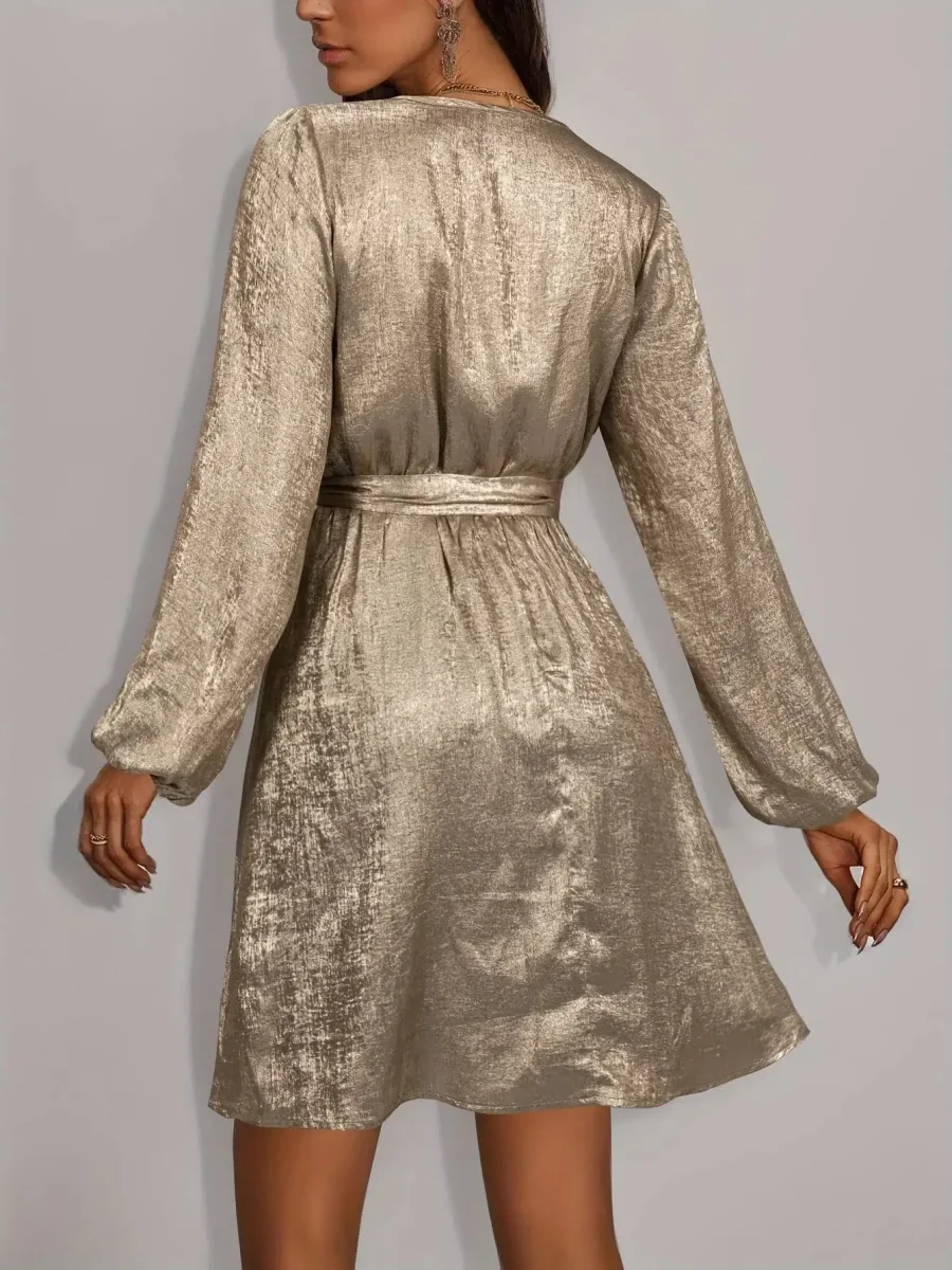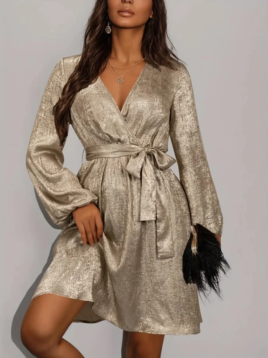 Laissez-vous séduire par notre sublime robe champagne qui illuminera votre silhouette. Confectionnée dans un satin luxueux aux reflets métallisés, cette robe courte sublime votre féminité avec son décolleté cache-cœur en V et sa coupe évasée. La ceinture à nouer à la taille et les manches bouffantes apportent une touche romantique qui fait toute la différence. Cette pièce captive la lumière à chacun de vos mouvements, créant un effet scintillant d’une élégance rare qui attirera tous les regards.