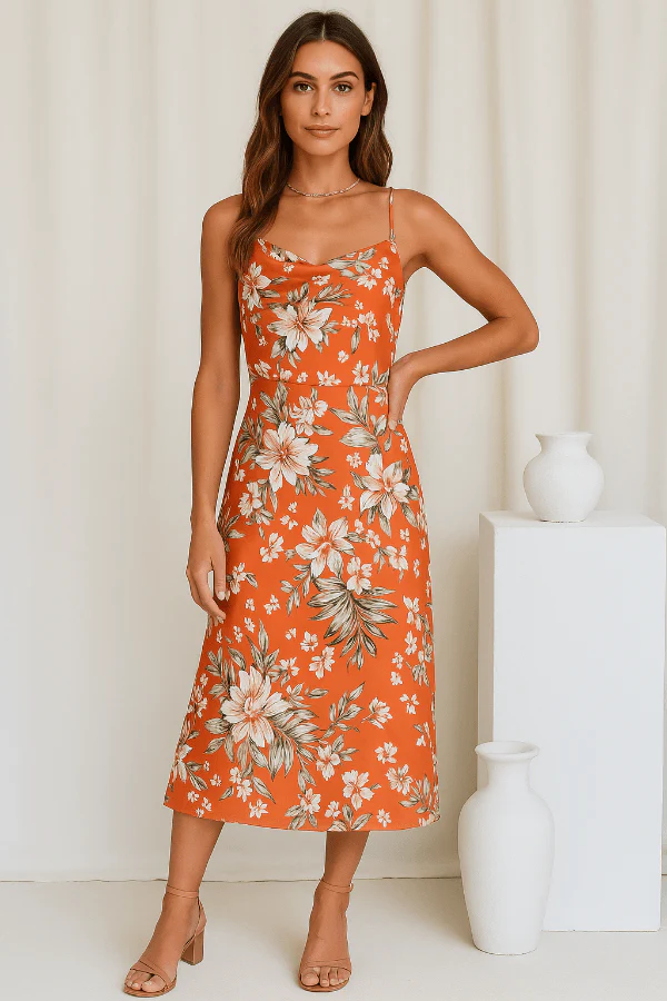 Type de coupe : Ajustée Matériau : Polyester léger et fluide Bretelles : Fines et ajustables Décolleté : Col en V Dos : Ouvert, décolleté en V Longueur : Mi-mollet Couleur : Terracotta avec imprimé floral