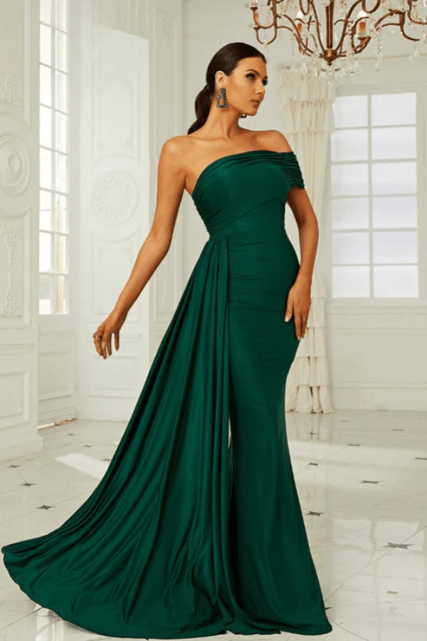 Coupe : Fourreau, sirène Matière : fibre synthétique fluide Encolure : Asymétrique, épaules dénudées Détails : Drapé latéral, effet plissé Fermeture : Zip invisible au dos Coloris disponibles : Vert émeraude
