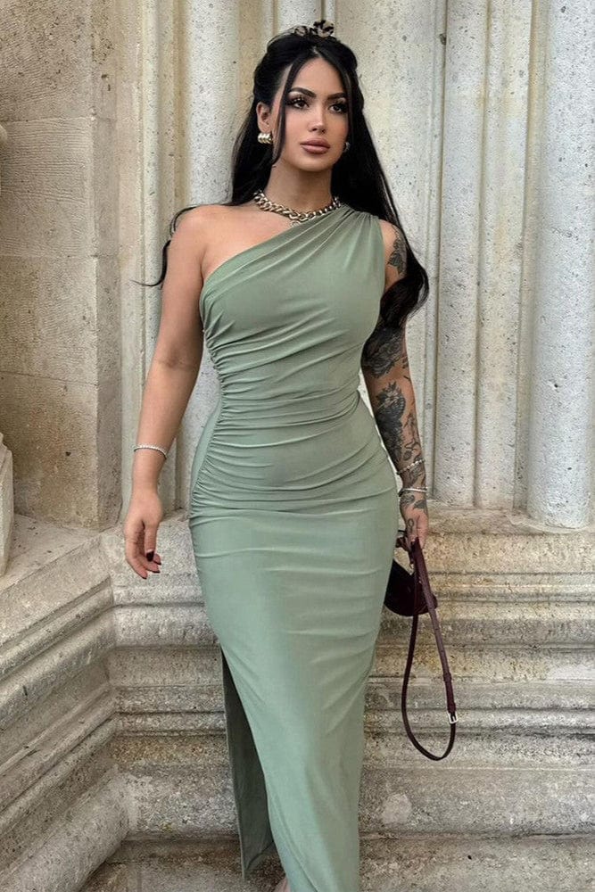 Type de coupe : Fourreau ajusté Matériau : Fibre synthétique Fermeture : Aucune Couleur : Vert sauge Longueur : Longue Détails : Fente latérale Style : Chic