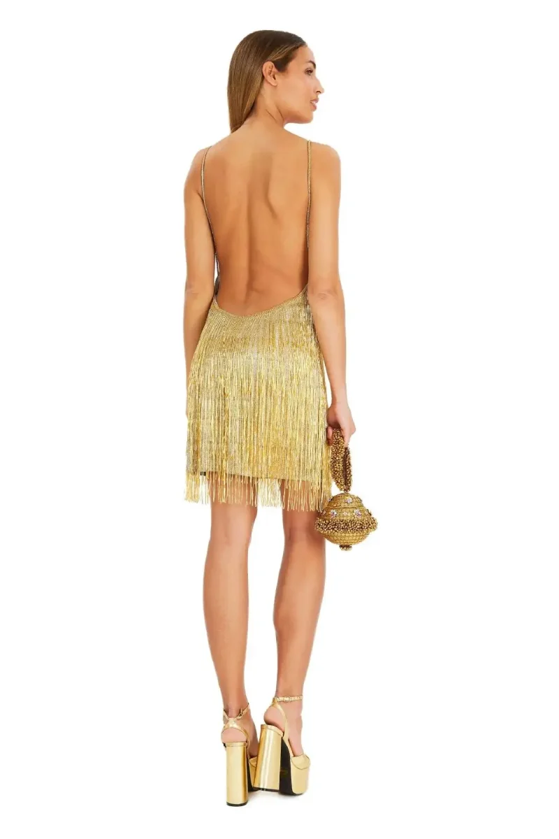 Chaque mouvement dans cette robe devient une expérience sensorielle où les franges s’animent dans un ballet doré, attirant tous les regards vers vous.