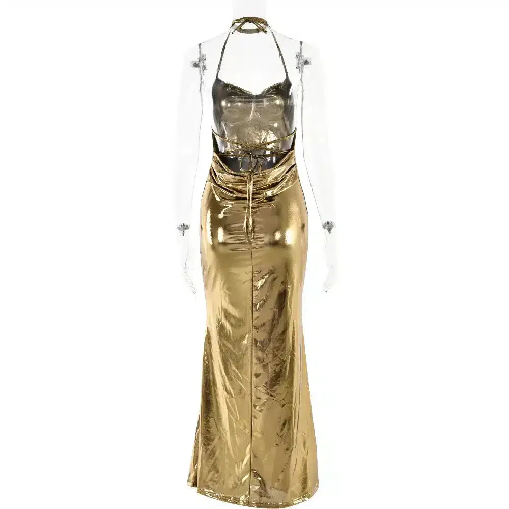 Confectionnée en satin extensible métallisé avec une coupe moulante maxi. Disponible en tailles S, M, L avec bretelles ajustables pour un maintien parfait. Lavage à la main recommandé pour préserver l’éclat du tissu.