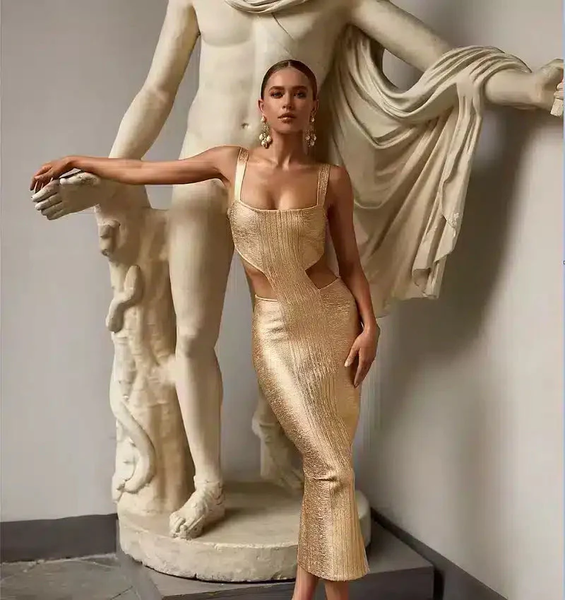 Laissez-vous séduire par notre robe glamour dorée qui capturera tous les regards. Cette création audacieuse allie élégance et sensualité avec son tissu métallisé qui scintille délicatement à chaque mouvement. Sa coupe moulante met parfaitement en valeur votre silhouette, tandis que les découpes latérales dévoilent subtilement votre peau pour un effet mystérieux et séduisant. Le bustier structuré avec ses bretelles spaghetti sublime votre décolleté, et les lignes verticales texturées allongent magnifiquement votre silhouette.