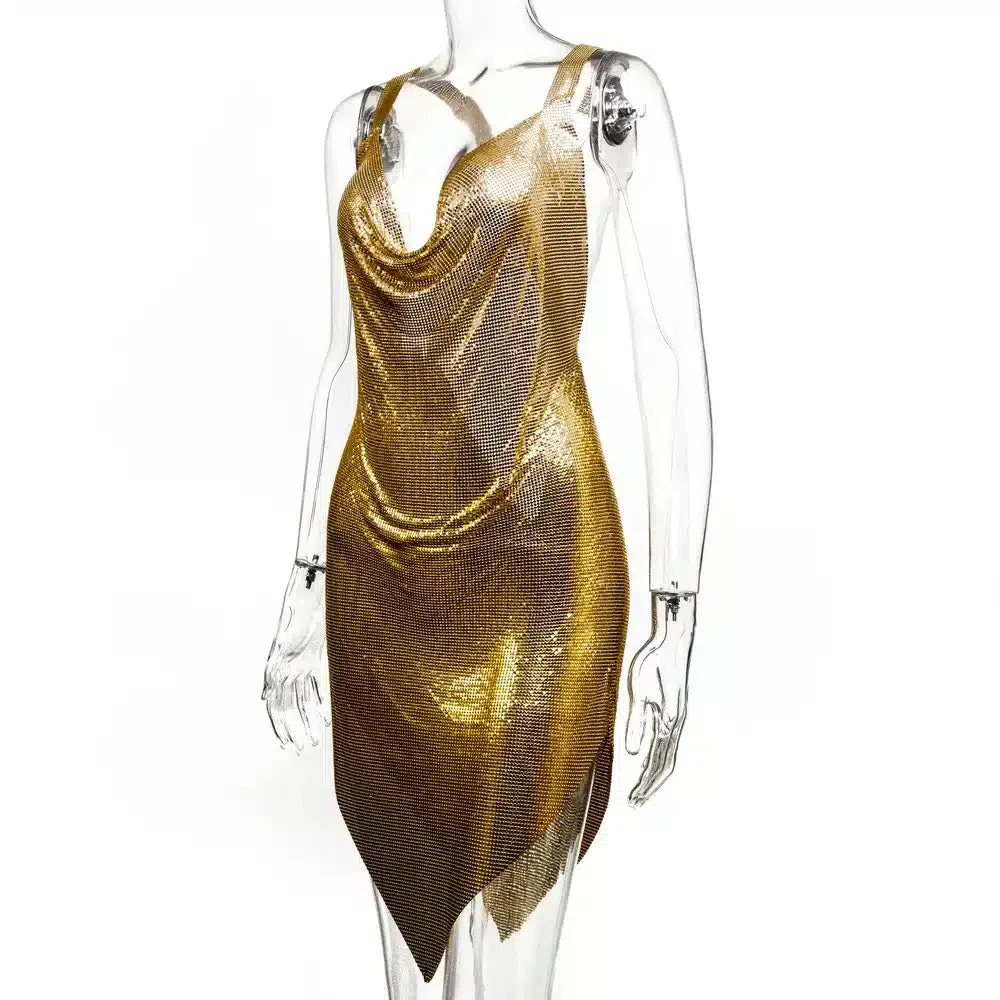 Laissez-vous séduire par notre robe glamour éclatante qui épouse parfaitement les courbes de votre silhouette. Confectionnée en satin luxueux avec des reflets métallisés, cette robe moulante se distingue par sa coupe asymétrique audacieuse et son décolleté plongeant. Son éclat doré capte merveilleusement la lumière, transformant chaque apparition en un moment d’exception.
