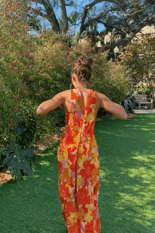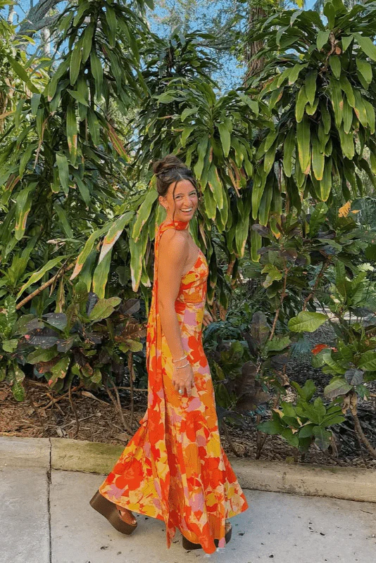 Type de coupe : Fluide et longue Matériau : Polyester léger et extensible Manches : Sans manches Encolure : Col carré Imprimé : Floral orange