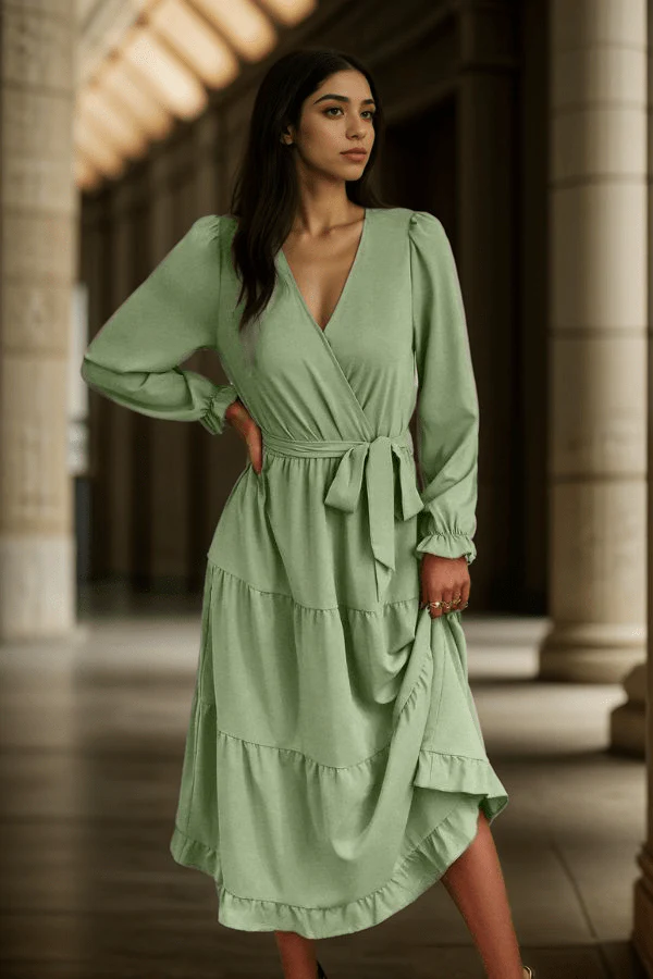 Cette belle robe vert sauge marie sophistication et confort pour vous accompagner dans vos moments les plus mémorables. Elle assure une allure chic et féminine. Sa coupe élégante et ses finitions soignées capteront tous les regards. Elle est la pièce idéale de votre garde-robe pour les mariages, les cocktails ou les soirées d’été.