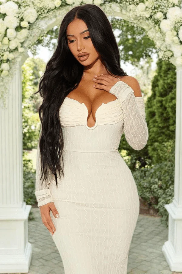 Matière : Tissu synthétique Coupe : Silhouette gaine moulante Décolleté : Col bardot drapé, épaules dévoilées Manches : Longues, semi-transparentes, ajustées Dos : Décolleté discret, sans fermeture apparente Détails : Tissu texturé à effet ondulé, tombé fluide