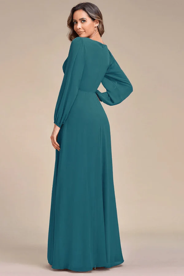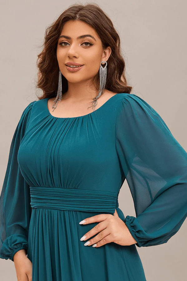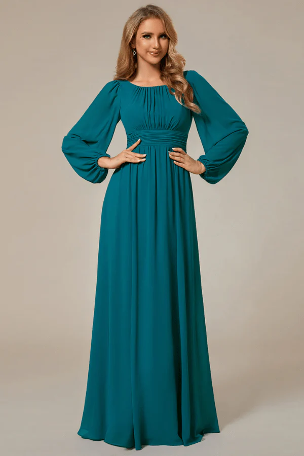 Type de coupe : Évasée Matériau : Mousseline légère en polyester Manches : Longues et bouffantes Encolure : Col rond Fermeture : Zip discret au dos Couleur disponible : Bleu canard Longueur : Jusqu’au sol