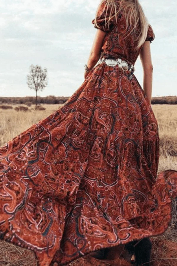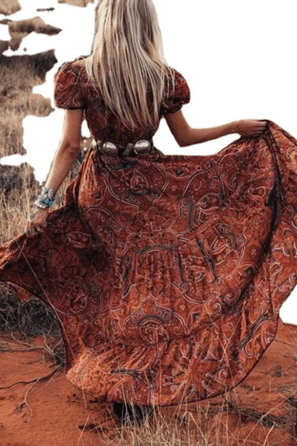 - Détails : Décolleté plongeant, manches bouffantes, imprimé ethnique