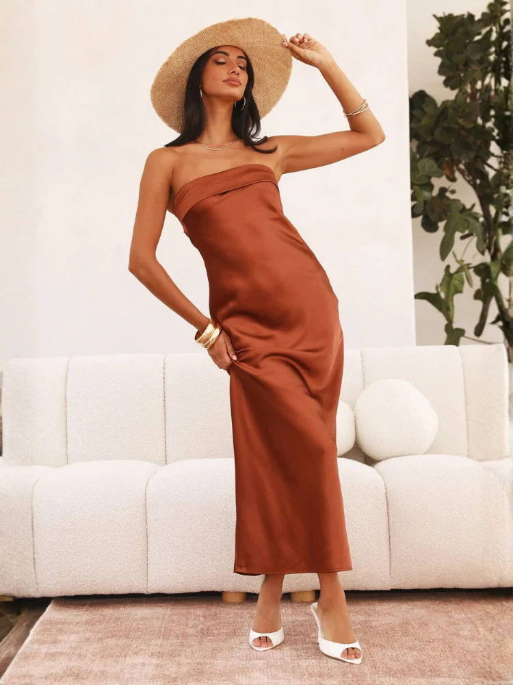 Élégante et moderne, cette robe longue en satin terracotta sublime la silhouette grâce à sa coupe fluide et son tombé lisse. Idéale pour les soirées, occasions et événements estivaux.