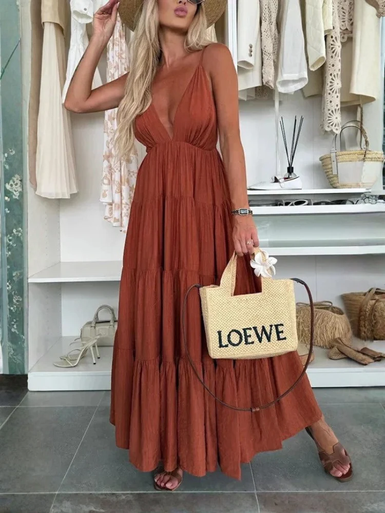 Grâce à son dos nu et à ses étages plissés, cette robe crée un mouvement naturel et une silhouette aérienne. Sa coupe longue et fluide est idéale pour les journées ensoleillées, les vacances ou les sorties estivales.