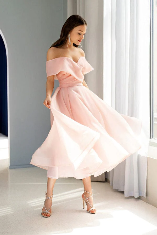 - Détails : Épaules dénudées, jupe ample, taille marquée
