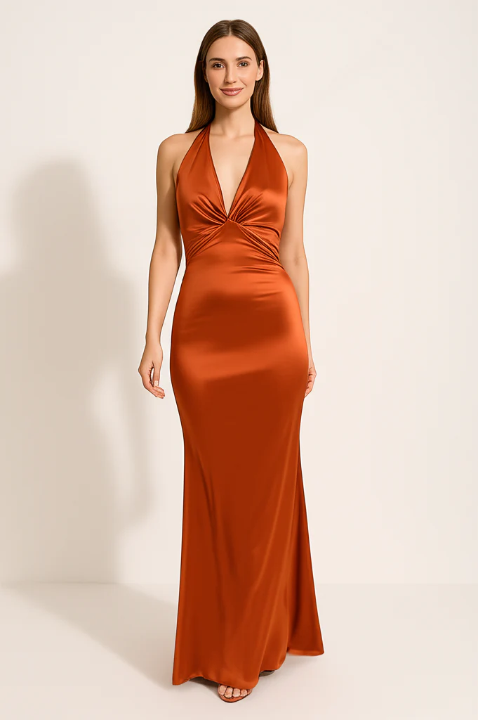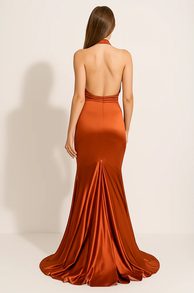 Sublimez votre silhouette avec cette robe longue satin orange au design halter qui dévoile élégamment votre dos. Son décolleté en V met en valeur votre buste tandis que sa coupe sirène épouse parfaitement vos courbes pour se terminer par une traîne fluide. La matière satin de qualité supérieure capte la lumière à chacun de vos mouvements, offrant des reflets chatoyants qui ne passeront pas inaperçus.